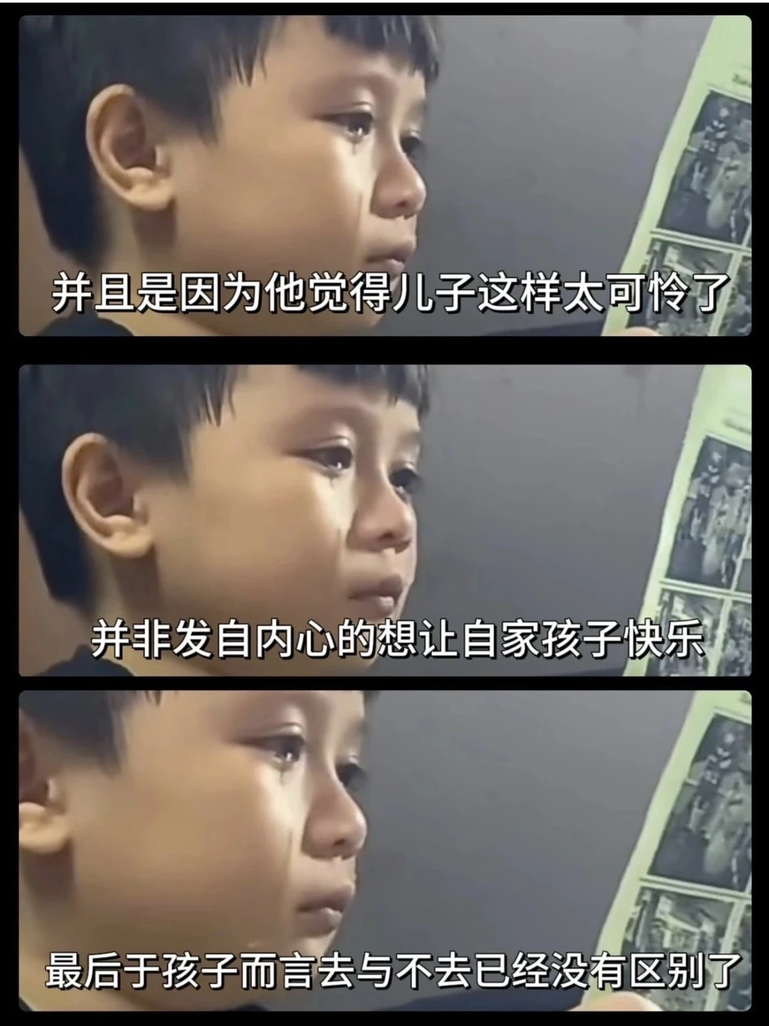 最近有一个让人心碎的片段:“一个小男孩,因为爸爸不允许他参加学校的郊游,静静地哭了一个小时。他没有大声抗议,只是默默地流泪。最后,爸爸心软了,同意他去。但那一刻,孩子的快乐已经被泪水冲淡,去与不去,似乎已无分别。”