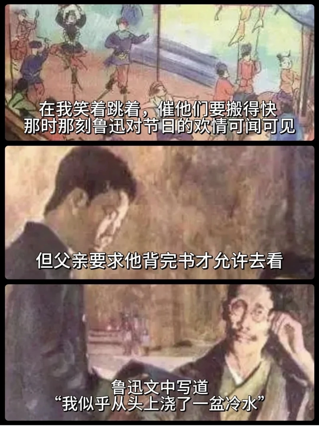 他描述了自己儿时对节日的渴望,却被父亲要求背书才能去玩。尽管他最终背完了书,但那份期待和快乐已经消失,那份被冷水浇灭的热情,那份最终的失望,兴致也没有了,只有少年那无法弥补的遗憾。