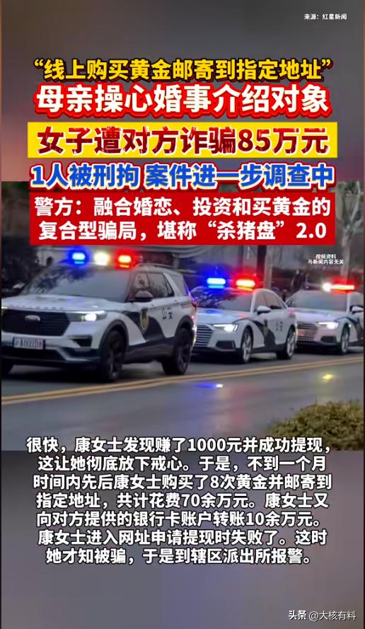 “防不胜防!”近日,甘肃兰州,一女子被母亲介绍了个相亲对象,两人就在网上联系。后来,对方告诉他有赚钱渠道,她觉得母亲介绍的应该靠谱,就相信了对方。前期还能提出点钱,直到投进去85万,才发现自己被骗了。网友:杀猪盘又升级了! 据媒体3月19日报道,康女士一直单身,母亲很担心她的婚事。今年,母亲从网上给她找了个相亲对象,说是各项条件都很好。 康女士也没细问,只觉得既然是母亲介绍的,应该靠谱,就搁网络上进行了联系,又互相发了照片。 不久后,对方声称,自己有一个内部投资平台,赚钱比较容易,康女士心动了,就试了试。他先从平台上自己花钱购买了黄金,然后寄到广东的一个地址,随后平台就额外给她收益。 康女士先花两万多买了20克,然后寄了不出,不久就发现自己赚了1000,而且顺利提现了。从此,她放下了心,又先后购买了8次,花费70多万,还给对方转了10多万。可等自己想提现时却发现提不出来了,这才意识到被骗了,赶紧报了警。 目前,警方已抓获了一名犯罪嫌疑人,并追回了10万元。 警方提醒,这是一个新型的杀猪盘,它将婚恋、投资、黄金等都融合到了一起,先借相亲降低受害者的防备,随后实施诈骗。广大群众一定要记住一件事,凡是让你掏钱的,就一定要小心;凡是说有内部渠道让你投资的,一定是诈骗! 信息来源:《女子与母亲介绍的相亲对象交往被骗85万,1人被刑拘,警方:融合婚恋、投资和买黄金的复合型骗局,堪称“杀猪盘”2.0
