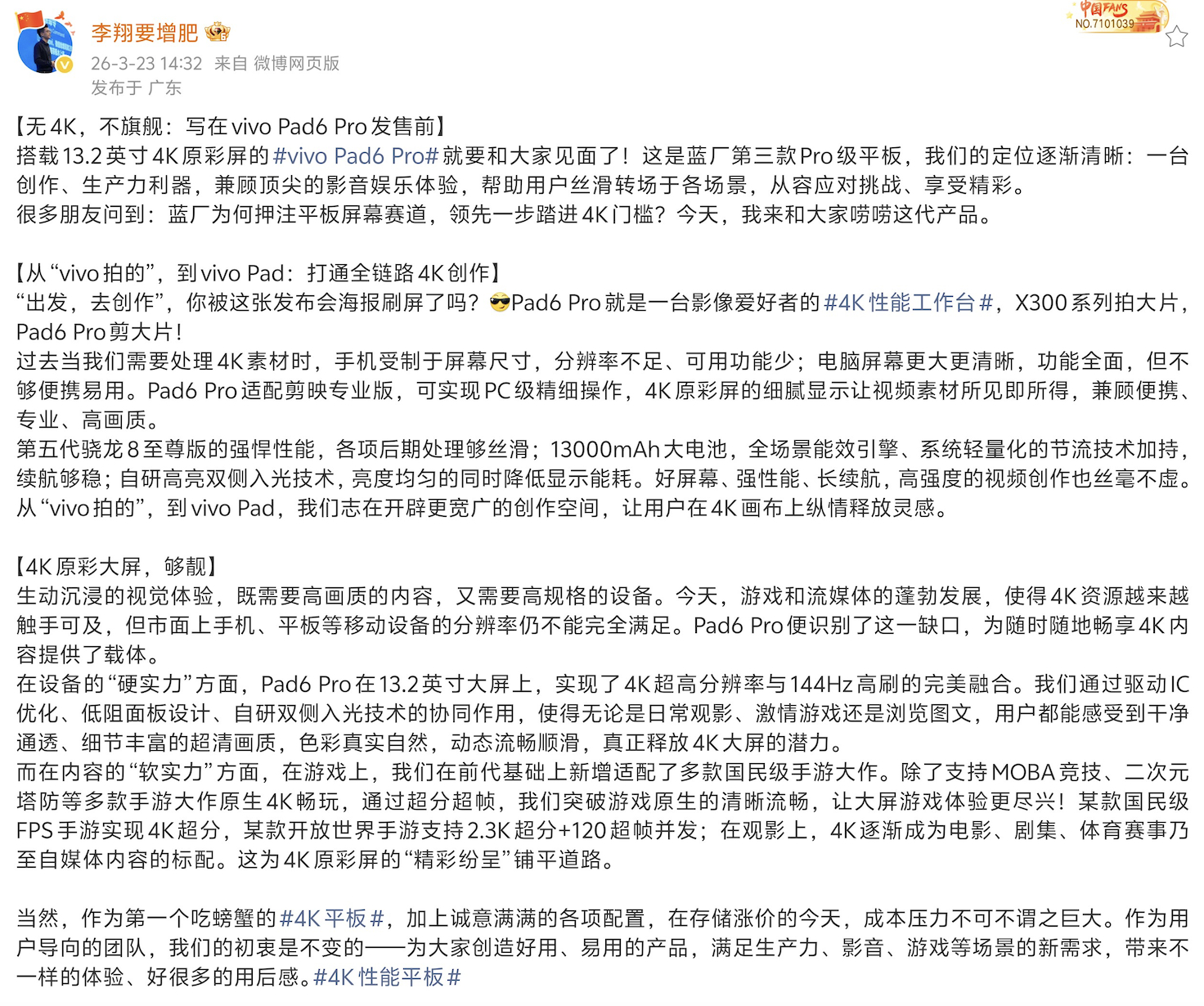 最近vivo重磅新品不断,除了移动影像领域的X300系列之外,还有搭载了行业首发4K原彩屏+杜比视界的vivo Pad6 Pro,在影音、游戏、办公和创作等方面,4K平板带来的体验将远超以往。这次的新平板,还支持手机拍平板剪全链路4K创作,“无4K,不旗舰”的口号马上就坐实了。而且还搭载了搭配第五代骁龙8至尊版芯片,屏幕实力和性能都拉满。今年因为闪存等元器件涨价很凶,整个行业都感觉压力山大,不过这种看得见的体验升级,反而更让人想入手。