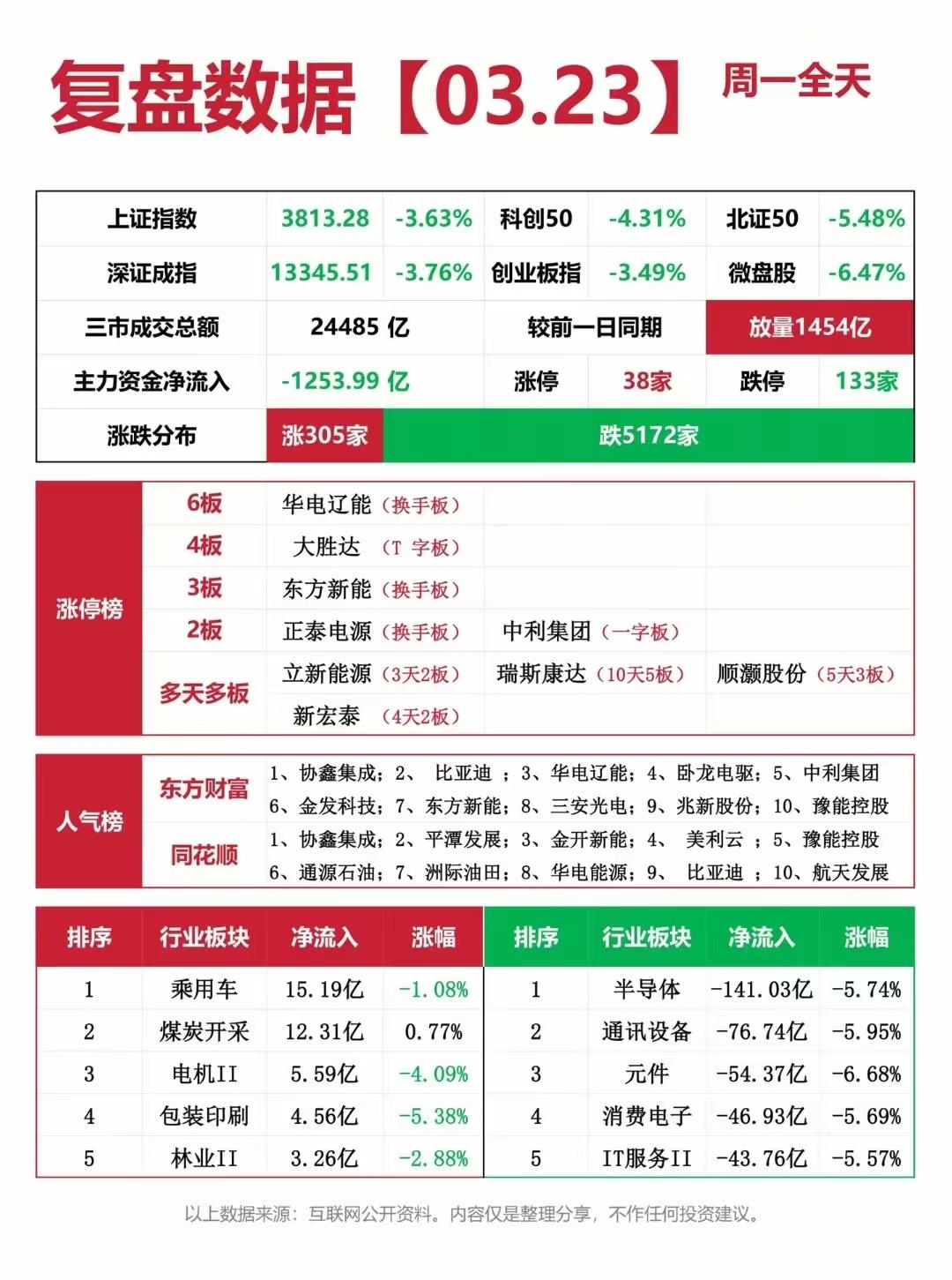 23日A股复盘整理+明天行情分析! 黑色周一!三大指数重挫沪指失守3800点,明天能否止跌反弹?23日三大指数全线重挫,沪指跌3.63%失守3800点,深成指、创业板指跌幅均超3.4%,北证50更是暴跌超5%。两市成交额放量至24485亿,主力资金狂泄超1253亿,涨跌家数比惨至305:5172,跌停个股达133家,市场情绪降至冰点。 明日(3.24)大盘走势预测:大概率探底后止跌弱反弹,难现大阳线,以缩量修复、小阳/十字星为主。支撑位3780点左右;压力位3850-3880点…~ 记住:真正的投资者,是在别人恐惧时保持清醒,我们一起扛过这波调整,向阳而生🌞! ⚠️ 以上为市场综合预判,不构成投资建议,操作以控仓为主。复盘资料取材网络仅供参考,不能作为投资依据。理财有风险入市需谨慎。