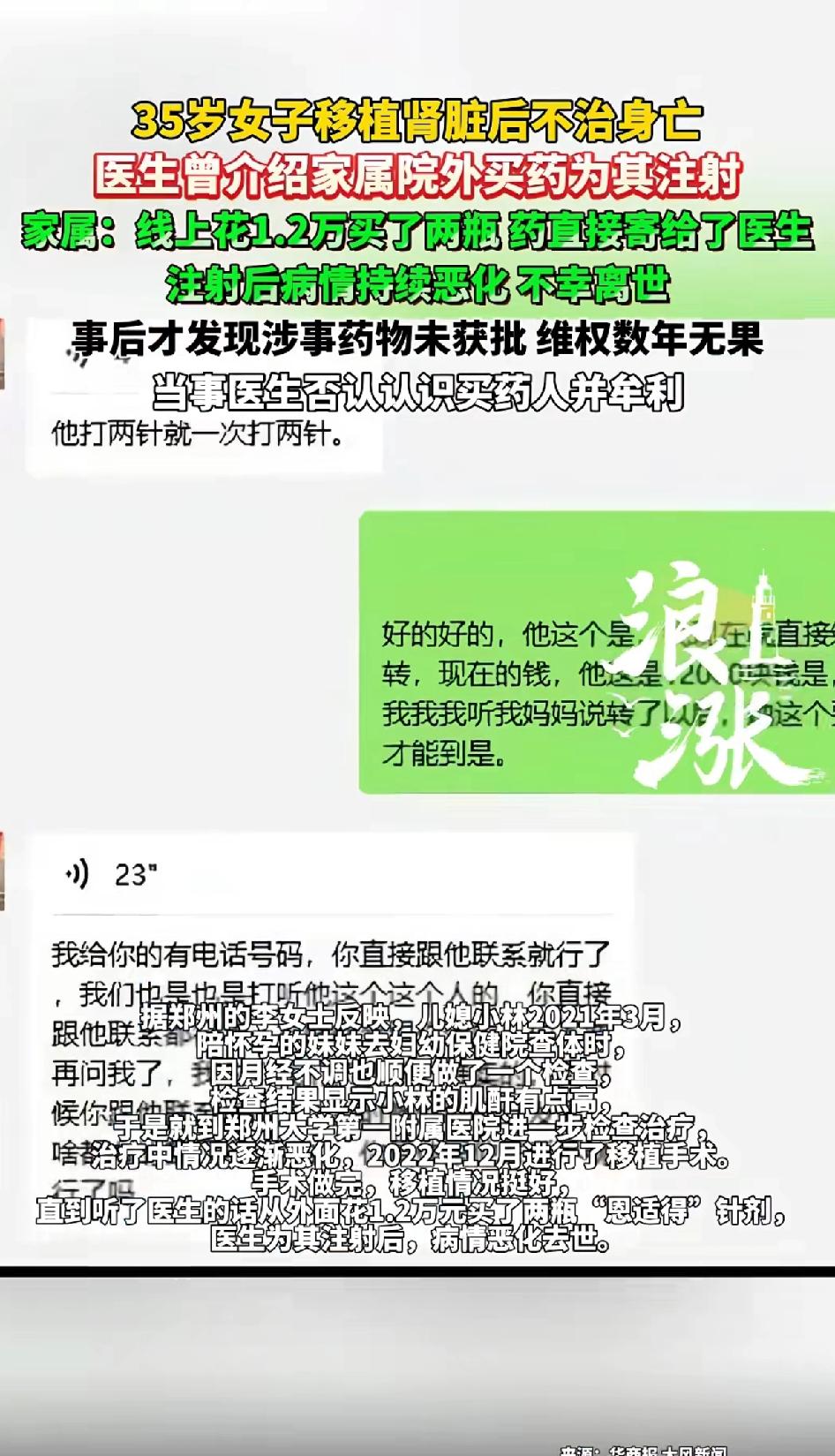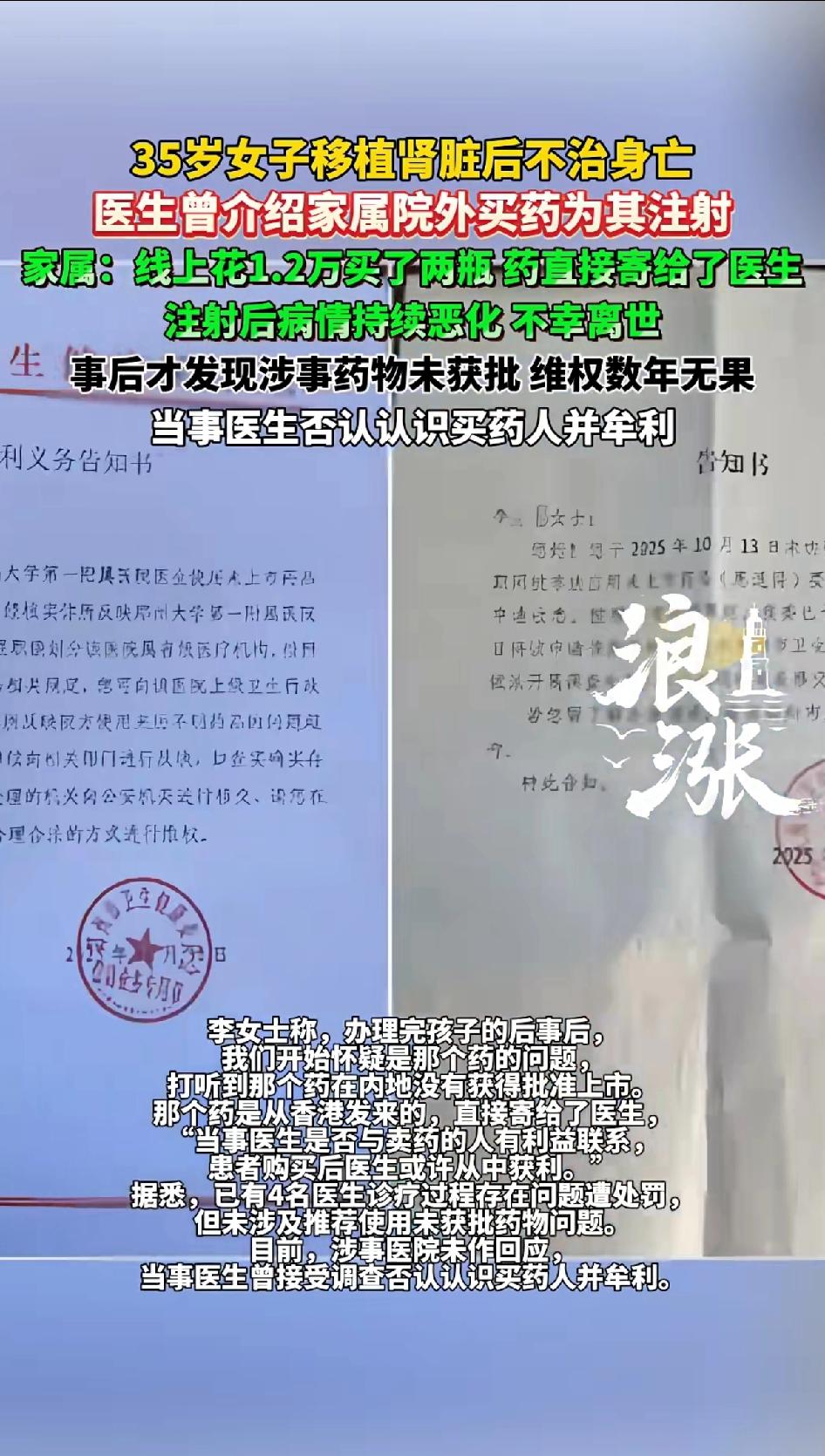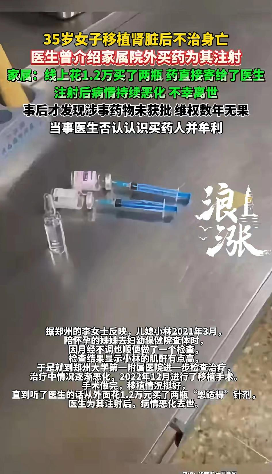 35岁女子移植肾脏后不治身亡,医生曾介绍家属到院外买药为其注射。家属线上花1.2万买两瓶药,药直接寄给了医生,注射后病情持续恶化,病人不幸离世。 事后才发现涉事药物未获批准,维权多年无果,当事医生否认认识买药人并未牟利。 35岁女子小林肾移植后不治身亡,这事太让人痛心了。2021年小林查出肌酐高,在郑大一附院治疗,2022年12月做了肾移植手术,本来移植情况挺好。 可疫情期间,主治医生让家属通过指定渠道买“恩适得”针剂,说有正规发票。结果打完药,小林没了。 家属多年维权,涉事医生和医院因病历问题被处罚,但医生推荐未获批药物一事调查无果。肾移植后死亡是否算医疗事故,得看医疗机构和医务人员有无过错。 这事儿医生推荐院外买药,实在让人怀疑其中有猫腻,希望能早日给家属一个公道。