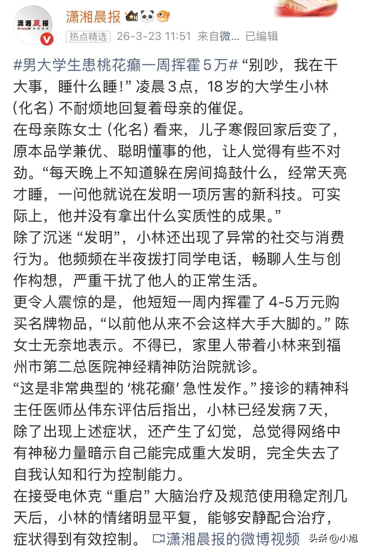 凌晨3点,陈女士的手机响了。电话那头,18岁的儿子小林声音亢奋得吓人:“别吵,我在干大事,睡什么睡!” 陈女士后来跟医生说,儿子寒假回家后整个人都不对了。 以前这孩子品学兼优,回家就看书,跟她有说有笑。现在每天晚上把房门一关,不知道在鼓捣什么,天亮了才睡。陈女士问他,他说自己在搞一项能改变世界的重大发明。可陈女士偷偷进去看过,房间里啥也没有,就对着电脑,屏幕上是些乱七八糟的东西。 最让她想不通的是花钱。 短短一周,小林刷了四五万块,买的全是名牌衣服、名牌鞋。陈女士翻账单的时候手都在抖,这孩子以前买个几百块的东西都要犹豫半天。她问儿子买这些干嘛,小林说:“我需要这些东西,我要见重要的人。” 除了花钱,小林还开始半夜给同学打电话。 一打就是一两个小时,聊什么人生理想、创作构想。同学家长都找上门来了,说孩子被骚扰得没法睡觉。有家长直接在电话里跟陈女士吵起来了:“你儿子凌晨两点打电话,说什么要改变世界,我孩子明天还要上课!” 陈女士说,那几天她感觉天都塌了。 家里人实在没办法,把小林拖到了福州市第二总医院神经精神防治院。接诊的丛伟东医生看了一眼就说,这是“桃花癫”急性发作,医学上叫双相情感障碍的躁狂相。 丛医生检查后发现,小林已经发病7天了,而且出现了幻觉。他总觉得网上有什么神秘力量在暗示他,说他能完成重大发明。他自己完全意识不到出了问题,还觉得全世界都欠他一个机会。 医生说这种病最麻烦的地方就在这里:患者发病时压根不觉得自己有病。 你跟他说你疯了,他觉得你才疯了。他是真的相信自己是天才,是真的觉得自己在干大事。所以很多家属都跟陈女士一样,一开始以为孩子就是青春期叛逆,或者最近压力大。等到发现不对劲的时候,钱已经花出去了,人际关系也搞僵了。 什么叫桃花癫?说白了就是脑子里的刹车坏了。 北京大学第六医院的专家解释过,人的大脑里有几种神经递质在调节情绪:5-羟色胺、去甲肾上腺素、多巴胺。正常的时候,这些物质保持平衡,人该高兴高兴,该冷静冷静。但躁狂发作时,5-羟色胺活动增高,去甲肾上腺素功能亢进,多巴胺也跟着活跃起来。 这就跟踩了油门没刹车一样。患者满脑子都是“我能行”“我最牛”“我要干大事”。所以小林觉得自己能搞出重大发明,觉得半夜给同学打电话是畅谈人生理想,觉得花几万块钱买名牌是理所当然。 他不是飘了,是脑子真出问题了。 丛医生说,这种病春天特别容易发作。 为什么偏偏是这时候?春季日照时间变长,气温忽高忽低,气压也不稳定,这些都会影响褪黑素的分泌。睡眠节律一乱,神经递质就跟着乱。再加上开学压力、社交增多,有些人就扛不住了。民间有句话叫“油菜黄,人发狂”,说的就是这个道理。 医院给小林做了电休克治疗。 很多人一听“电休克”就害怕,以为很吓人。其实现在的改良电抽搐治疗已经很成熟了。医生会让患者睡着,然后用一道很弱的电流通过大脑,相当于把脑子“重启”一下。再配合用情绪稳定剂,几天后小林就安静下来了,能好好配合治疗了。 陈女士后来说,她到现在都想不通,好好的儿子怎么就突然成这样了。 医生说双相障碍通常在十几岁到二十几岁发病,有家族遗传倾向。很多患者发病前完全正常,品学兼优,聪明懂事。然后某一天,突然就变了。 好在陈女士发现得还算及时。 丛医生提醒说,家里要是有年轻人突然性情大变,话多、亢奋、不睡觉、乱花钱、说大话,千万别当他是“一时兴起”或者“最近心情好”。尤其是春天这个季节,要多留个心眼。如果连续几天都这样,就要考虑去医院看看了。 你们身边有没有见过这样的人?平时挺正常的,突然某段时间变得特别能说、特别能花、特别能折腾?后来怎么样了? 来源:综合中华网、潇湘晨报、福州市第二总医院、北京大学第六医院、人民卫生出版社资料