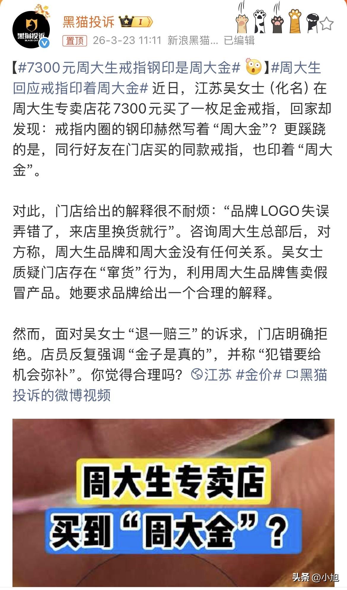 江苏吴女士到现在都觉得自己那天是不是眼花了。 她是在周大生专卖店里买的戒指,发票开的是周大生,刷卡刷的也是周大生,店员介绍的也是周大生。7300块钱,一枚足金戒指,买的时候店员热情得很,介绍款式、说纯度、讲工艺,就是从头到尾没提过这戒指跟“周大金”有什么关系。 回家之后她翻来覆去看了好几遍,戒指内圈清清楚楚刻着三个字:周大金。 她第一反应是以为自己买错了牌子。可不对啊,明明进的是周大生的店,抬头看见的招牌也是周大生,发票上印的还是周大生。这戒指怎么刻着别人的名字? 更让她心里发毛的是,一块儿去的朋友也在同一家店买了同款戒指,拿过来一看,里面同样是“周大金”。 两个戒指,同一家店,同一个问题。 吴女士赶紧给周大生总部打了个电话。总部的答复非常干脆:周大生和周大金没有任何关系。 这就怪了。总部说两家没关系,那戒指上为什么会刻着别家的名字?这戒指到底是从哪儿来的? 她去找门店要说法。店员的反应让吴女士更加想不通——对方很不耐烦地说,是品牌LOGO弄错了,让到店里换一个就行。 弄错了?钢印这东西是批量生产的,能把“周大生”印成“周大金”,这可不是写错一个字那么简单。这是两个完全不同的品牌名称,两个字都不一样,怎么印错的? 吴女士注意到一个细节:这枚戒指连吊牌都没有。正规品牌的首饰,出厂时都有吊牌,上面写着品牌、纯度、重量。这枚戒指连吊牌都没有,直接就这么卖了。 她开始怀疑,这是不是门店在玩“窜货”——简单说就是用周大生的招牌,卖的却不是周大生的货。钱进了周大生的账,货上刻的是别家的名。 门店反复强调一句话:金子是真的,犯错要给人改正的机会。 这话听起来很实在,但仔细一想,问题就出来了。如果只要金子是真的就行,那消费者干嘛非要去周大生的专卖店?随便找个金店买不就完了?周大生的牌子,卖的就是个正品保障和品牌信誉。现在的情况是,消费者花了周大生的钱,买到的却是不确定是不是周大生的货。 吴女士提出退一赔三,门店一口回绝了。店员翻来覆去就那句话:金子是真的,给个改正的机会。 这话让人听着挺耳熟的。好像每次出事儿,商家都喜欢说“给个机会”。问题是,消费者花了7300块买到的不是自己想要的东西,谁给她机会? 现在的问题是:这个钢印到底是怎么印上去的?如果真是周大生工厂出的货,钢印不可能印错。如果不是周大生工厂出的货,那这戒指是怎么进了周大生专卖店的柜台的? 总部说两家没关系,门店说是印错了。总部的钢印能印错到别人家去? 有网友扒出一个细节:“周大金”这个品牌确实存在,是一个黄金珠宝品牌,跟周大生没有任何股权关系。两个品牌独立运营,互相不搭界。那么问题来了,一个跟周大生毫无关系的品牌,它的钢印怎么会出现在周大生专卖店卖出的戒指上? 这枚戒指缺少吊牌这个细节也很关键。吊牌是产品的身份证,上面有品牌、纯度、重量、厂家信息。没有吊牌,就等于这枚戒指的“来路”查不到。门店为什么要把吊牌摘掉?是不想让人看到什么信息? 吴女士现在的要求很简单:她要一个合理的解释。到底是门店的问题,还是供应链的问题,还是两家之间有什么猫腻?除了她和朋友买的这两个,这家店里还有多少戒指刻着“周大金”? 店员的态度也挺耐人寻味。不是先道歉,而是先不耐烦。不是主动提出赔偿方案,而是说“换一个就行”。这种反应不像是不小心出了错,更像是早就知道会出这种事。 吴女士已经向当地12315投诉了。接下来就看监管部门怎么查,这枚戒指到底是从哪条渠道流进来的。 7300块钱买个戒指,上面刻着别人的名字。店家的处理方式是换一个,连句正经道歉都没有。你觉得这样能接受吗? (综合哈尔滨日报、@黑猫投诉、密山市人民法院等报道)