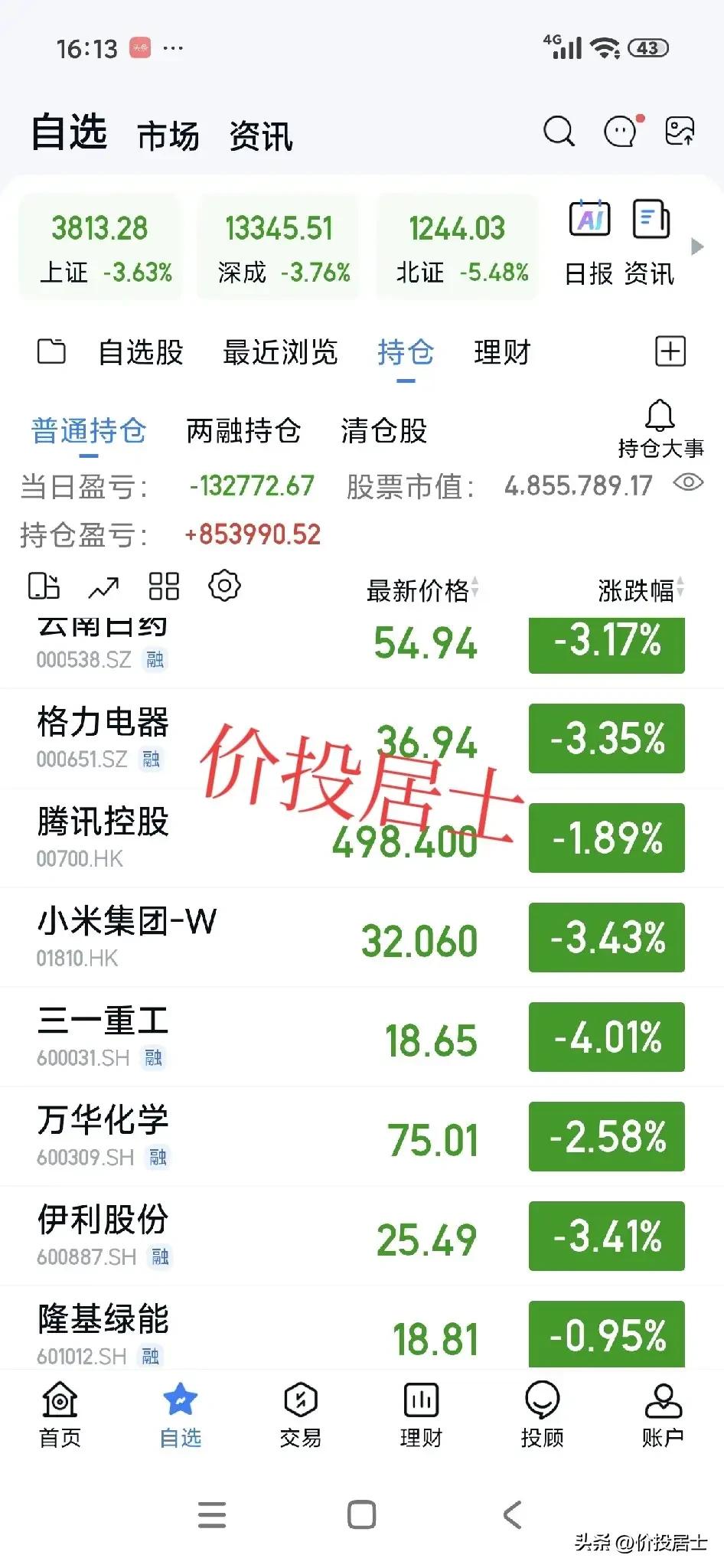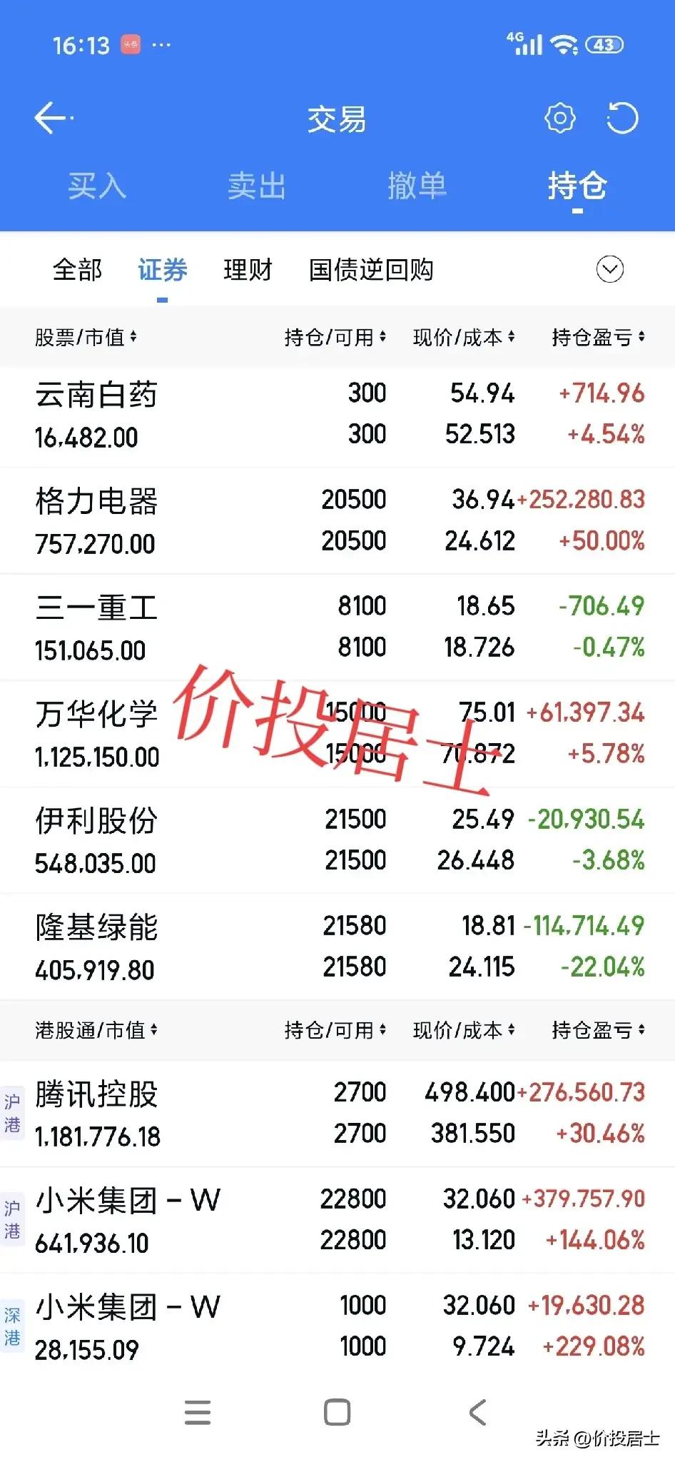 刚算了一下,实盘账号市值回撤100万左右了[笑哭]自高点回撤约17%!其实这非常正常,来到股市需要随时做好持仓回撤50%,甚至更多的准备,不然证明你根本承受不住资本市场的波动性[祈祷] 很多朋友问我为什么之前不止盈?其实我不光不止盈,我还不止损呢[笑哭]这就是我的交易体系,不按照短期股价波动进行交易!再说我又预测不了股市,我也不想挣我能力范围外的钱! 一个价值投资者其实他很多的行为,会让人认为其很反常[笑哭]但是如果真明白价值投资,就会知道他其实非常正常。 其实是这个逻辑,我买的是公司,又不是买的短期股价波动,所以短期股价波动与我何关呢?[笑哭]既然与我不相关,我又何必受其情绪左右呢?明白这个逻辑,就明白为什么我一直是心如止水的状态[祈祷]
