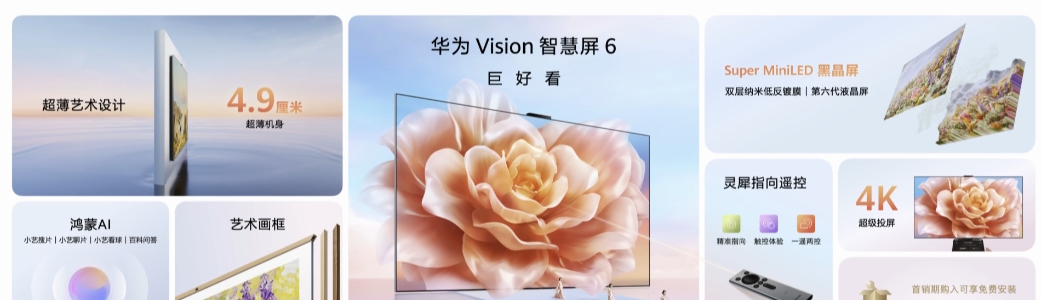 - 其他:厚 4.9cm,提供全新艺术画框,前置 8MP,支持 Wi-Fi 6、蓝牙 5.2,灵犀指向遥控器,HarmonyOS 4.3 系统。华为发布会