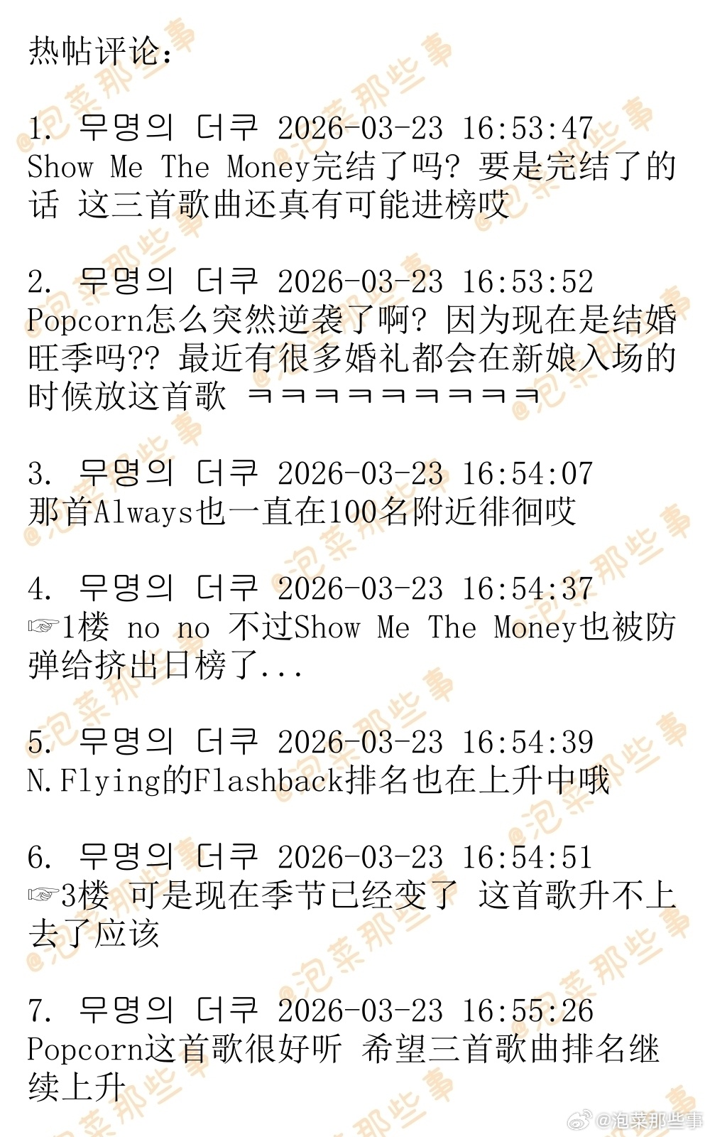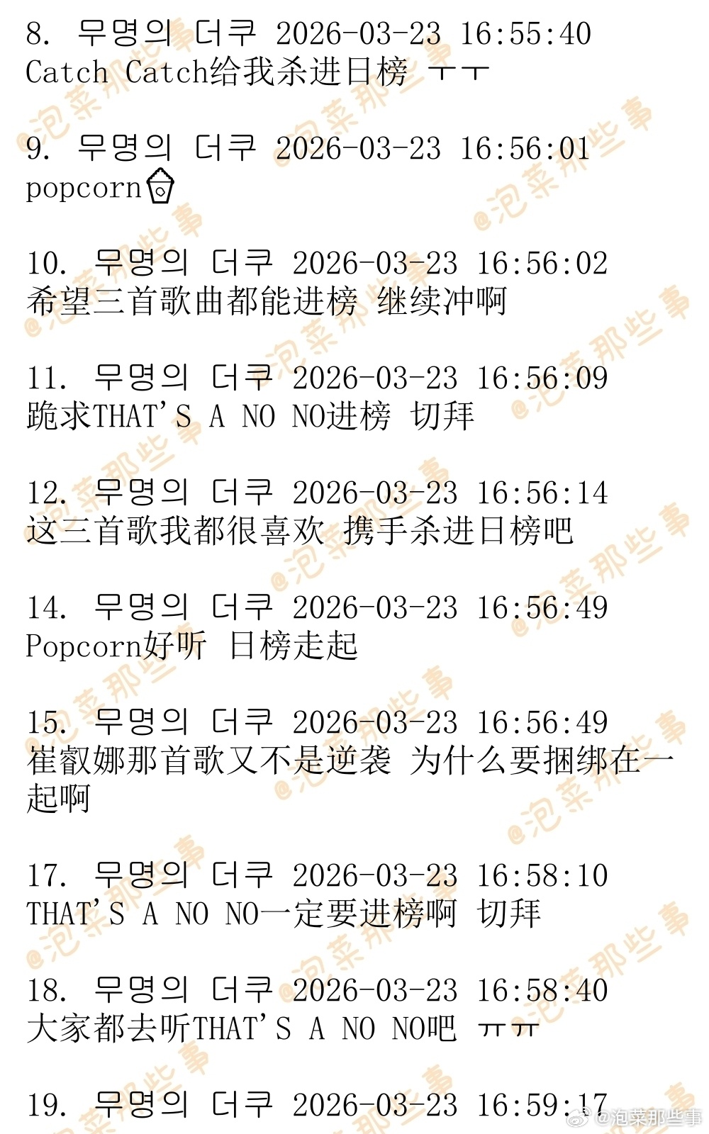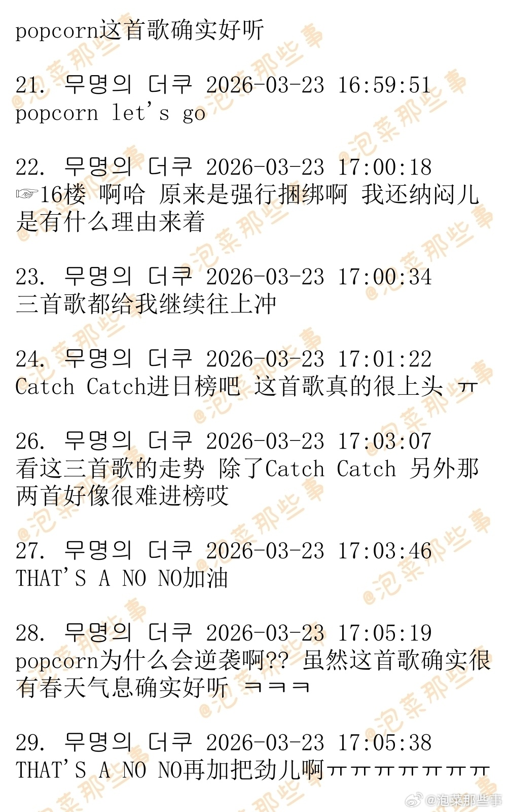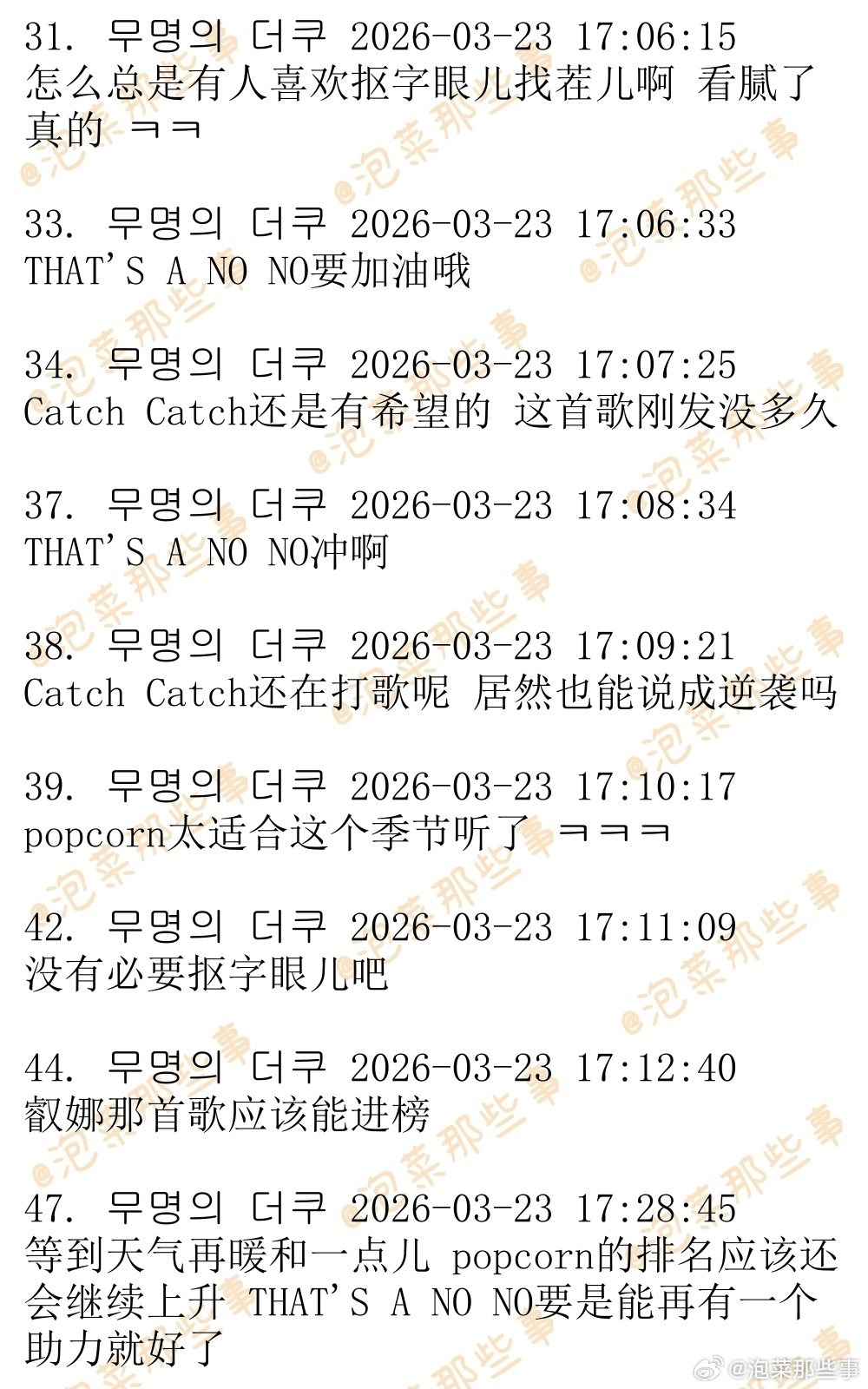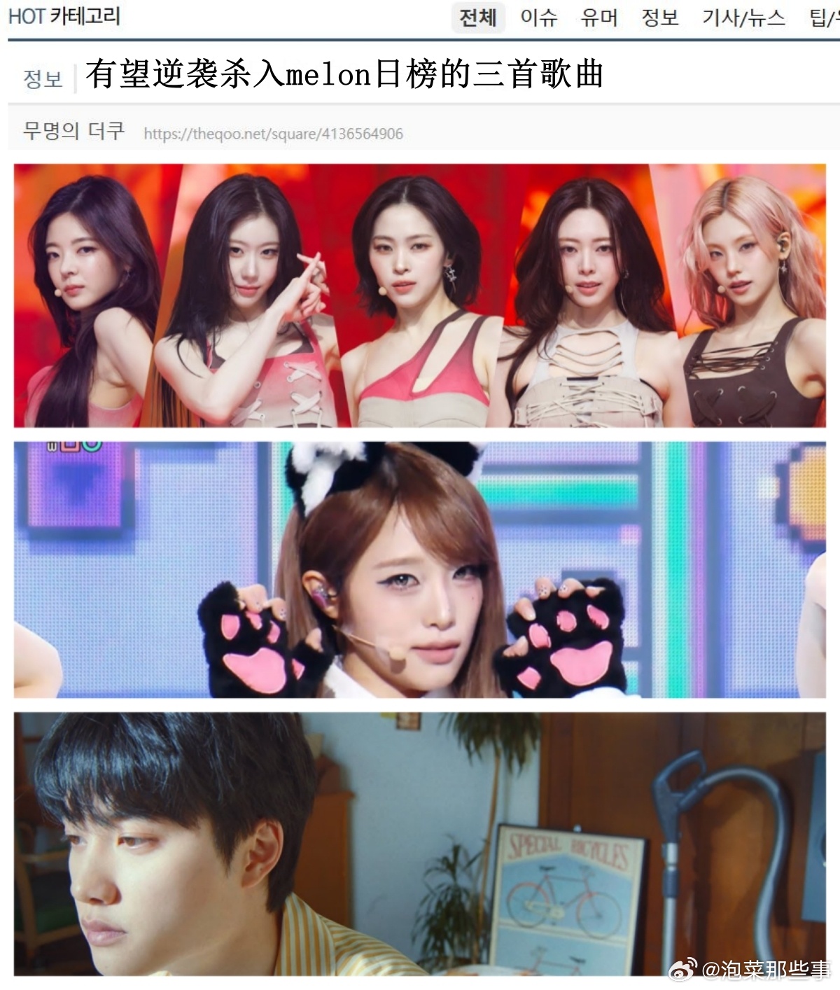 🔥韩网热帖评论翻译🔥有望逆袭杀入melon日榜的3首歌曲:ITZY《THAT'S A NO NO》崔叡娜《Catch Catch》D.O.都暻秀《Popcorn》P.S.现在日榜100位收听人数为4.5万左右 cr.theqoo