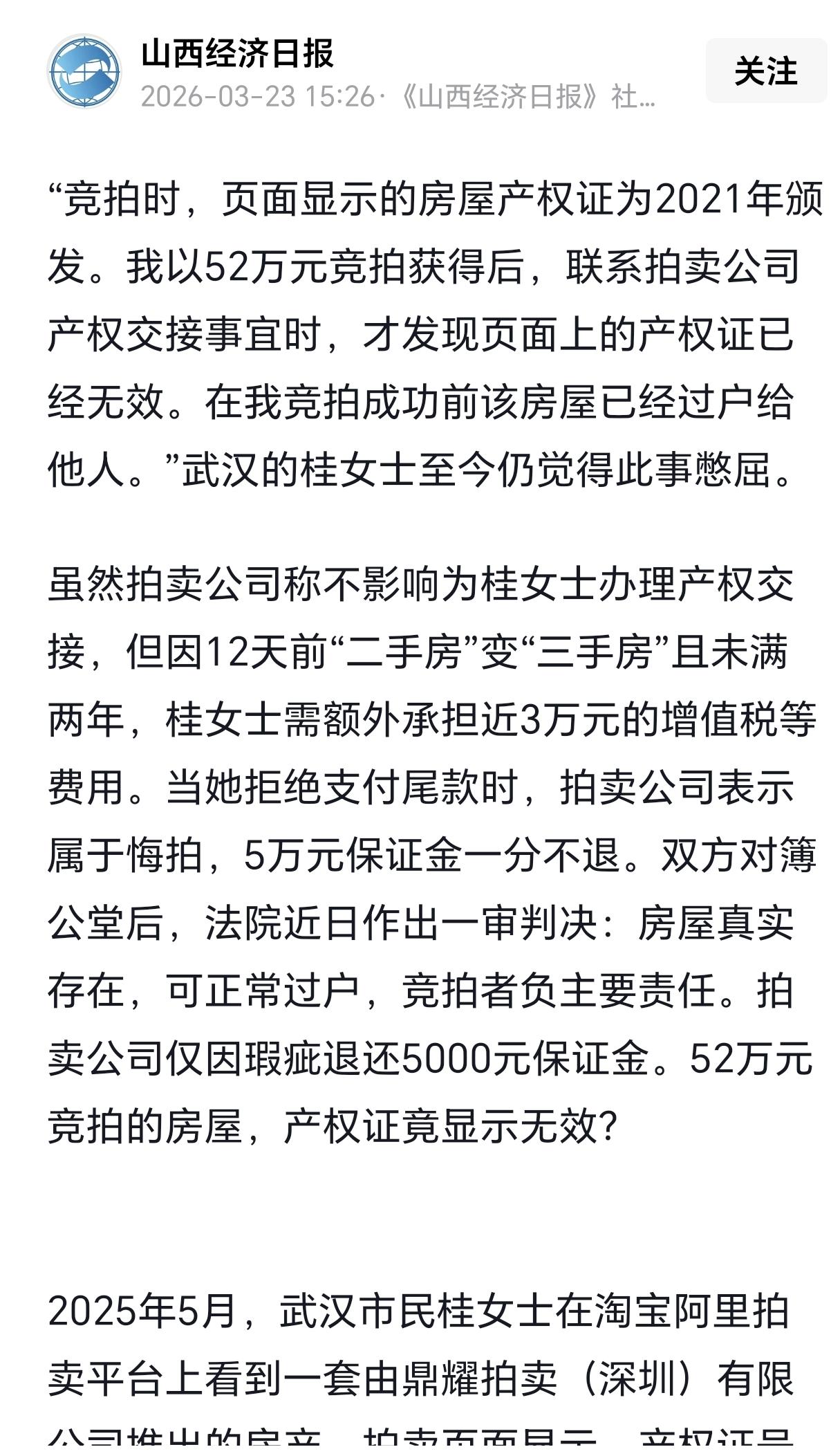 湖北武汉一女子花52万元竞拍获得房屋,结果办完手续一查,房子竟然12天前就悄悄卖给别人了,如再次过户因未满两年需承担增值税等近3万元! 信息来源:山西经济日报 想象一下:你好不容易在网上经过60轮激烈厮杀,以52.63万砸下了理想房,结果办完手续一查,房子竟然12天前就悄悄卖给别人了! 更气人的是,因为那12天,房子在第三人名下还没到满两年,国家规定要交5%的增值税,差不多得掏2.6万,连带附加税加起来将近3万块。 你说气不气人? 事情起源于去年5月,武汉的桂女士在淘宝阿里拍卖平台上看中一套武昌的房子,页面上那张“鄂(2021)武昌不动产权证”看得她心里踏实。 她等了好几天,5月20号一口气喊了60轮,最后喊到52.63万,眼看着就是她了。 可当她满怀期待地联系拍卖公司办过户时,对方一句话直把她雷蒙了——“这证已经是废证了,房子5月8号就过户给别人了。” 这一下,不光让她拿不下房,还要多掏近3万的税。 按政策,个人买的房满两年再卖免增值税,可一看时间线,2021年拿证没问题,可5月8日那一过户,让“持有时间”在别人名下只剩12天,必须交5%的增值税,得吃个大亏。 桂女士那叫一个郁闷:“同一套房,前03秒我还能免税,过了那12天我就要被额外收税,咋就这么坑人呢?” 更揪心的是,后来她跑着去现场看房,发现墙体渗水、地板烂透,厨房的水池一碰就漏,墙上满是发霉斑点,装修更是一股老房子味,照片里那个漂亮的样子跟实物简直判若两房。 她心想,连质量都跟宣传不符,尾款一分都不想交了,直接告诉拍卖方:“这房我不买了,把我5万保证金还我!” 结果拍卖公司不干了:“不付尾款就算悔拍,保证金一分不退。”双方从微信吵到电话,最后只能把事儿搬上法庭。 深圳龙岗法院一审下来,说白了,法院给出这么几个结论:房子是真的、能过户;屋子老化渗水是事实,但桂女士没拿出证据证明影响大框架;拍卖公司确实用的是废旧证、信息有瑕疵,但它在页面上也放了不少照片,还写明“以现场为准”。 况且那房子8月份又顺利过户给新买家,说明并没什么手续障碍;再说了,页面还有税费范围和咨询电话,桂女士自己没去核实,总体来说,是她主动放弃尾款,构成根本违约。 最后,法院判她承担九成责任,拍卖方认个轻微过错承担一成,退她5000块保证金,其余不退。 桂女士对这样结果不服,已果断提起上诉。 目前二审还在排期中。 知名公益律师赵良善看过案卷后直言,这拍卖公司责任被压得太轻了。 按照《拍卖法》第十八条、第六十一条,拍卖人必须主动、全面地披露房屋权属变动等重要信息,这直接决定了买家的成本和决策。 当年5月8号已经过户这么大事儿不及时告诉竞拍人,就是故意隐瞒重要事实,违背了法定义务。 律师建议二审一定要把拍卖公司的责任提上去,让他们承担主要责任。 这事给大家提个醒:网络看房就跟买保险一样,别只信网上“证照”和照片,上拍前一定要抽空去不动产登记中心查一查最新产权、查封、抵押、过户记录;如果实地看房必须亲自去,别全靠图片,现场水电、墙体、地板的状况都得过目;最后,整个过程要留下聊天记录、拍卖页面截图、产权查询单据,遇到权属信息前后矛盾时,要及时提出异议并保留证据。 买房子是大事,一旦上了当,损失可不只是几万块的保证金或增值税。 总之,如果有打算网上拍房的,一定要多留个心眼,别图一时方便,一旦出事后悔莫及。