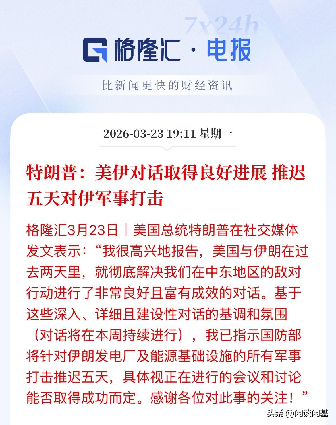 重磅突发,TACO交易再现!黑暗中的黎明来了,布伦特原油期货暴跌,原油期货市场全线暴跌,Wit原油暴跌12%,布伦特暴跌10%,市场都干懵了,特朗普说与伊朗对话取得良好的进展,推迟5天打击,全球资本市场开始狂欢了,A50猛拉涨幅超1.6%,现货黄金飙升、白银转涨,美股三大指数盘前猛拉全线涨幅超2%,交易员下调了对欧洲央行加息的押注,搞起来了。