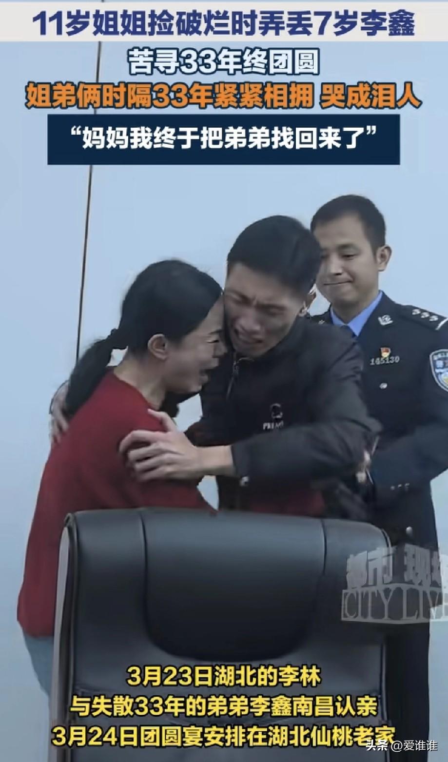 “重逢!”湖北,母亲病亡,父亲走失,11岁的姐姐带着7岁的弟弟捡破烂时,弟弟又被人贩拐走,如今33年后姐弟重逢,姐姐哭着喊到:“爸爸妈妈,我终于把弟弟找回来了!” 1993年,在湖北仙桃的一个普通家庭里,先是妈妈因为癌症走了,没过多久,爸爸受不了这个打击,精神出了问题,有一天出门就再也没回来过,家里头就剩下两个孩子,11岁的姐姐李林和7岁的弟弟李鑫,一夜之间,姐弟俩成了没人管的孩子。 一个11岁的女孩只能带着弟弟上街捡破烂,什么易拉罐、废纸板,别人随手扔掉的垃圾,就是他们填饱肚子的全部指望,姐弟俩就这么相依为命,谁也没想到,更大的苦难还在后头。 到了1994年,李林带着弟弟出门的时候坐错了车,稀里糊涂跑到了湖北京山,人生地不熟,乱哄哄的,有个陌生大妈不知道跟弟弟说了什么,就把7岁的李鑫带走了,一个11岁的姐姐,眼睁睁看着弟弟消失在人群里,她拼命找,但一个孩子又能跑多远,从那天起,弟弟就彻底没了音信。 有人说姐姐是用弟弟换了吃的,这话传了很多年,李林只回了一句话:“我没有用弟弟换吃的!”这几个字说出来,轻飘飘的,可她心里的那份委屈和自责,一背就是33年。 弟弟李鑫被带走以后,其实第二天跑出来过一次,他跑回到跟姐姐分开的地方,到处找,但怎么也找不到姐姐,结果没跑远,又被抓了回去,关起来,挨打,受了不少罪,后来好不容易又逃出来,就开始了一路要饭的日子,他说,“我当时就是找姐姐嘛,是我唯一的目标。”可那时候他太小,连家到底在哪个省哪个市都说不清楚,只能一路走一路要饭,河南、湖南、湖北、广西,最后晃到了广东,他只知道往南走,却始终找不到回家的那条路。 姐姐这边也没停下来过,李林后来去了宁波,结了婚,安了家,但她心里一直扎着一根刺,她给自己定了三个目标:保住老家的房子、找到弟弟、找到爸爸,为了攒钱找弟弟,她什么苦活累活都干过,刷盘子、进工地、进工厂,只要给钱她就干,别人问她干嘛这么拼命,她说,“我走的每一步,都是为了存钱,找弟弟找爸爸。” 这些年她也在网上发过寻亲信息,可不少人看完以后觉得太离谱了,母亲病亡、父亲失踪、弟弟走丢,一个人把苦全吃了一遍,哪有这么惨的事,有人直接说她编故事,是炒作,李林没争辩,只是继续找,只要攒够一点钱,就跑到外面去找,跑了二十多年,始终没放弃。 事情真正出现转机,是因为一个人,南昌铁路公安局的民警汪挺,这人是个1992年出生的年轻警察,专门负责“团圆行动”,帮不少被拐的孩子找回过家,之前还参与找回过被“梅姨”拐卖的孩子,2026年初,汪挺联系上了在广东的李鑫,给他发了一段寻亲视频,说“你姐姐要找你”,视频里那些话一下子勾起了李鑫小时候的记忆——跟姐姐一起捡破烂、一起流浪的日子,那个他以为早都忘了的姐姐,一下子又回来了。 汪挺这头也没闲着,他手上没有李鑫最近的照片,只能从大量资料里一点一点比对。据说他前前后后翻看了上万张照片,靠着脸部的表情和眼神,愣是把李鑫从人堆里找了出来,今年3月11日,采血比对的结果出来了,确认是亲姐弟。 李林接到消息的时候,在视频里哭着说,“姐姐寻找你20多年,半条命都快没了,终于等到了,可以告慰天上的母亲。”二十多年,她终于能对妈妈说一句,弟弟找回来了。 3月23日,姐弟俩在南昌铁路公安局见了面。44岁的李鑫一进门,看见姐姐就哭了,嘴里喊着“姐姐”。李林一把抱住他,哭得浑身发抖,嘴里一遍遍地说,“我找你找得好苦啊,姐姐对不起你,终于把你找回来了。”弟弟一边哭一边拿手帮姐姐擦眼泪,轻声安慰她。那场面,在场的人没有不抹眼泪的。 姐姐特意准备了蛋糕。她还记得弟弟小时候特别羡慕别的小孩过生日,那时候姐弟俩用捡破烂凑的钱买了一个小蛋糕,弟弟高兴得不行。那天弟弟说,“我终于有生日了。”姐姐就告诉他,那就定在八月十五,咱姐弟俩同一天过。三十多年过去,这回姐姐亲手喂弟弟吃蛋糕,算是把这个生日补上了。 网上看到这条新闻的人,眼睛都红了。虎扑上有人说,“泪目,所有人贩子都没有好下场!”还有人替姐姐心疼,“尤其是姐姐,很难想象这33年怎么过来的。”也有人聊起背后的苦,“妈妈也一样,不经历这个,没准还活着。丢孩子的人后半辈子真不知道该咋活。”更多的人直接骂人贩子,说就该千刀万剐。 认亲完了以后,李林要带弟弟回湖北仙桃老家,去看看他们小时候一起长大的地方。她的寻亲路还没走完,她说接下来还要继续找爸爸。李鑫也还记得爸爸最后一次出现的样子,他说,“他带我们回家,却永远走出了这个家。” 三十三年,当初那个11岁的小女孩,如今已经44岁了,她这半辈子,好像就干了一件事,找弟弟,这回,她终于能对弟弟说一声“对不起”,也终于能对天上的妈妈交差了!