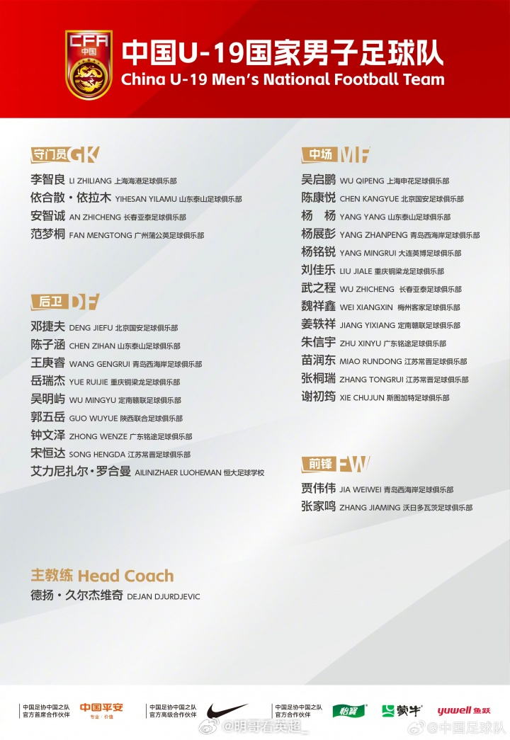 还差1场达劳工证!U19国足3月国际比赛日期间将在义乌参加国际青年足球邀请赛,对阵澳大利亚U19。主帅久尔杰维奇征召的28名球员中,效力于塞尔维亚联赛的张家鸣入选。张家鸣司职前锋,身高1米93,今年2月从辽宁铁人加盟英超伯恩利,随后被外租至塞尔维亚的沃日多瓦茨U19队。