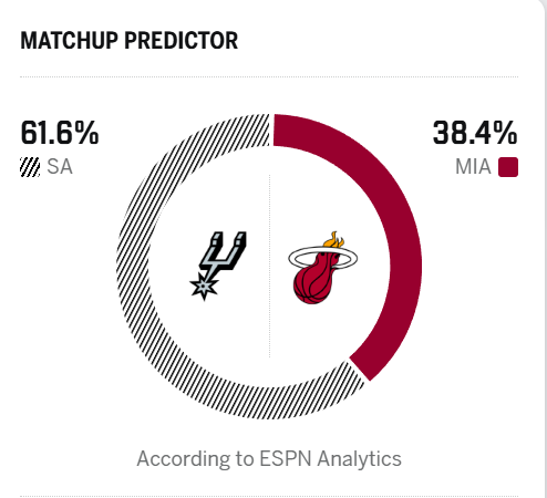 ESPN预测明日比赛:马刺胜率61.6%,热火胜率38.4%