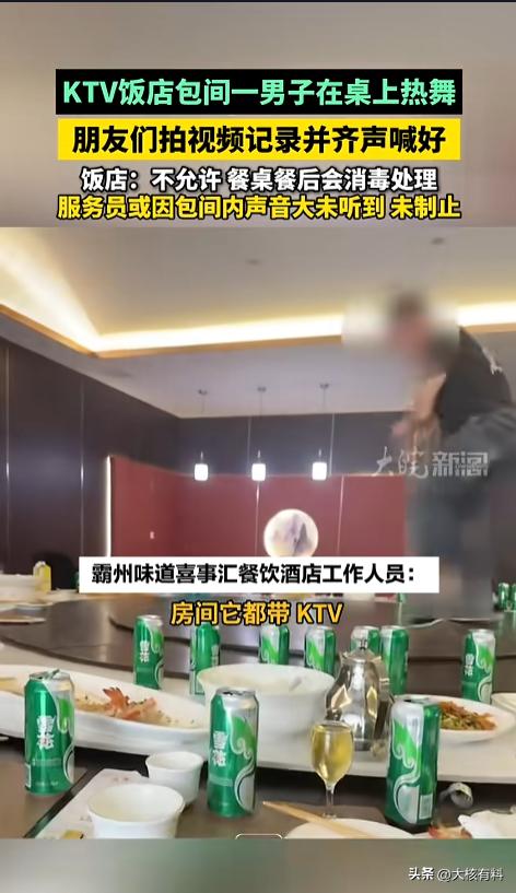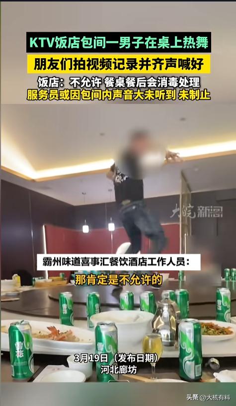 “脸都不要了!”近日,河北廊坊,一KTV饭店包间内,男子竟在饭桌跳起了舞。它站在圆桌中间的转盘上,手臂来回摆动,腿也跟着抖动,搁上面来回踱步转圈。转盘被他踩得剧烈晃动,跟要散架似的,周围人竟还齐齐叫好!网友:磕了? KTV饭店是一个放松的地方,吃饭之余,还能唱歌娱乐一下,活跃下气氛,是不少人聚餐的选择。不过,也有些人在里面做出些不雅的事来。 据媒体3月19日报道,事发当日,一群人正在包间里聚餐,一个男子在餐桌上跳起舞来。男子腿脚不断地在桌子上抖动,手臂摆来摆去,还搁上面转了个圈。 舞姿看不出来有多美,下面的转盘倒是被他踩得不堪重负,止不住地晃动,就跟要散架一样。旁边的好友不仅没有制止,甚至还在一旁拍照起哄,齐声叫好。 事后店方回应,店里是不允许这么做的,应该是服务员没有发现,不然肯定会制止的。桌子倒是没坏,也不用担心卫生问题,每次餐后都会进行消毒处理。 网友看后表示,这么没素质的事,怎么还一堆起哄的,这不应该上前制止么?可能给人家造成困扰不说,万一自己再摔下来,受了伤怎么办,是不是还要再去找店家索赔? 信息来源:《KTV饭店包间一男子在桌上热舞 KTV饭店包间一男子在桌上热舞,朋友们拍视频记录并齐声喊好,饭店:不允许 餐桌餐后会消毒处理,服务员或因包间内声音大未听到 未制止》大皖新闻