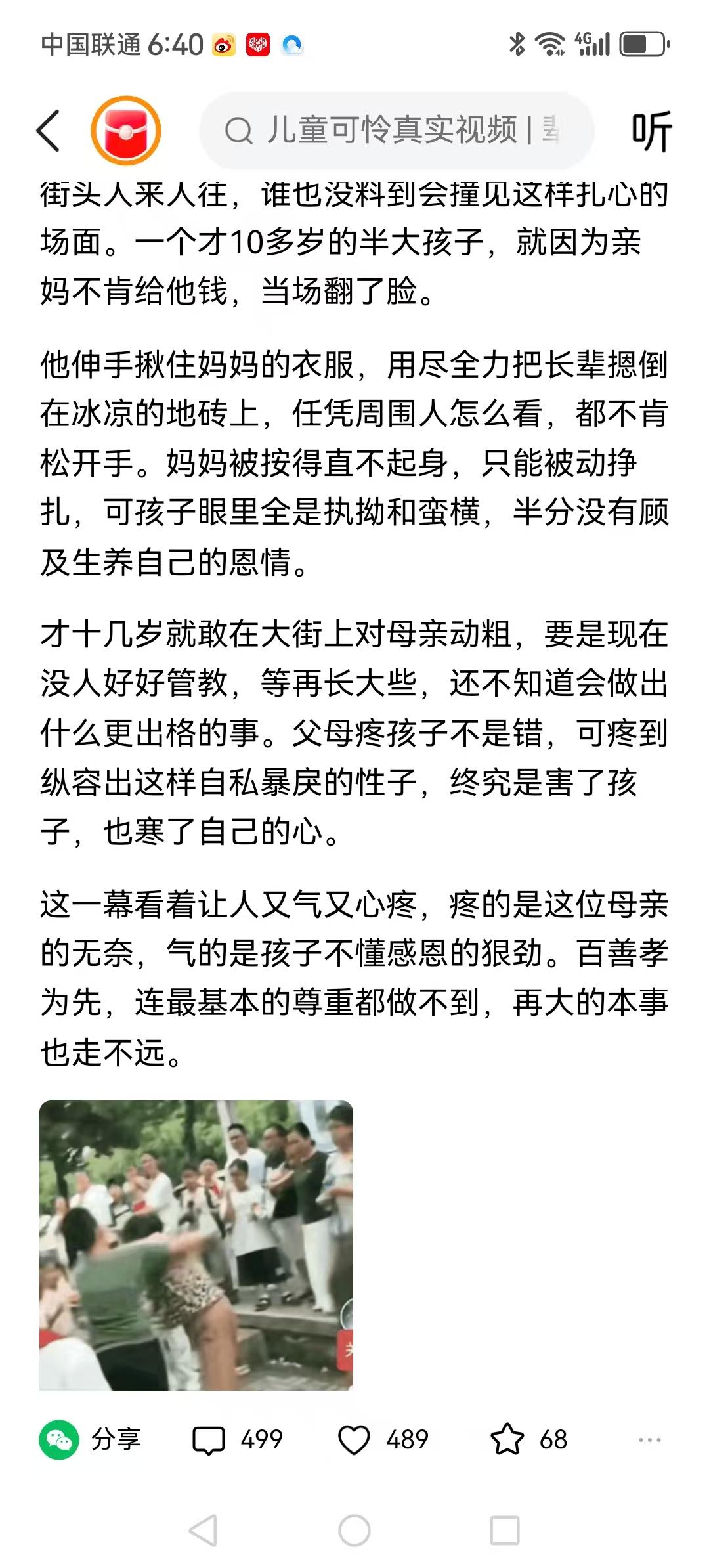 谁也没料到会撞见这样扎心的场面。这就是溺爱孩子的后果,现在终于反噬到自己身上了,种什么因得什么果。 父母老师都要说服教育孩子,他们是弱势群体,要拿起法律武器保护自已。可以告老师·告家长。 自己惯废的小混蛋!该!孩子就是不能宠,该管教的时候就得管教,从小树立正确的人生观,三观正,比啥都重要。 掍头底下出孝子,小树不整修,如何长成材,惯子如杀子,必须从小教育。 家庭教育的严重缺失,才造成公众场合的肆意妄为,今天这个家庭父母再不好好管教,将来或许只能让国法惩处啦! 有些事情不能看偏面,这都是家教无方,家长有很大的责任。 可能有先天障碍吧,这就很无奈了,社区街坊大家帮帮忙吧! 孩子的教育就在三岁到六岁之间,超过这个时间,想管你也管不了,象这孩子要想管好,就又难上加难了。
