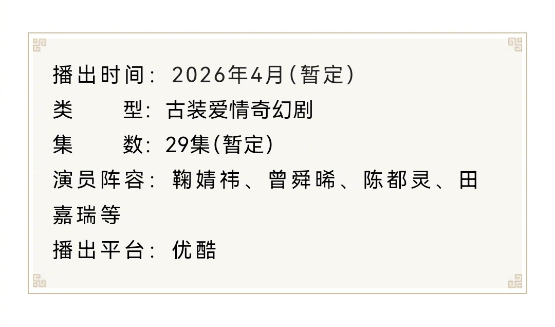 古装奇幻剧《月鳞绮纪》开启招商,预计4月👖开播。郭敬明执导,鞠婧祎、曾舜晞、陈都灵、田嘉瑞领衔主演。