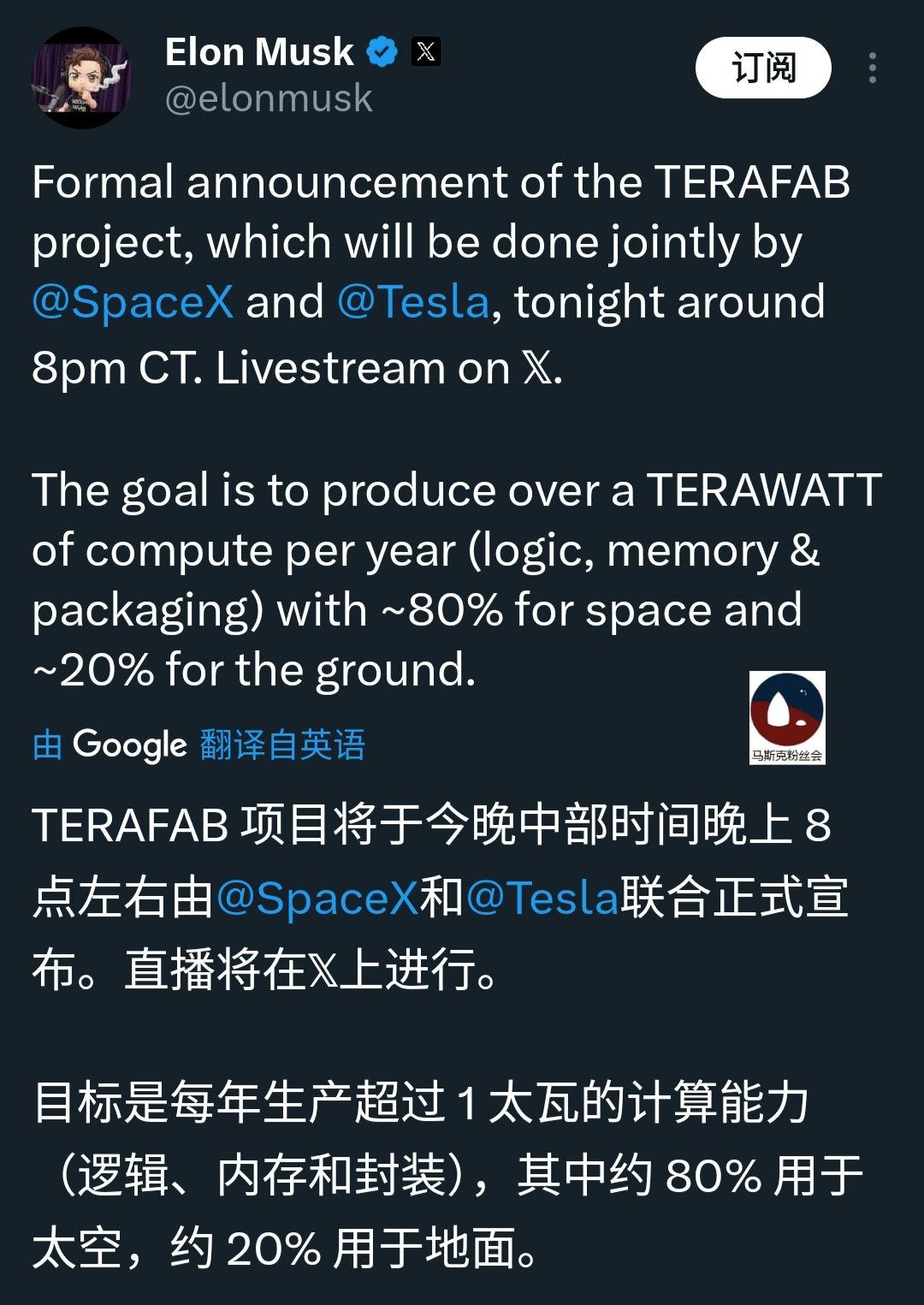 terafab启动 马斯克终于还是开始做芯片了。 马斯克引领人类前行。 马斯克一定是神派来带着人类进入下个阶段文明的使者。