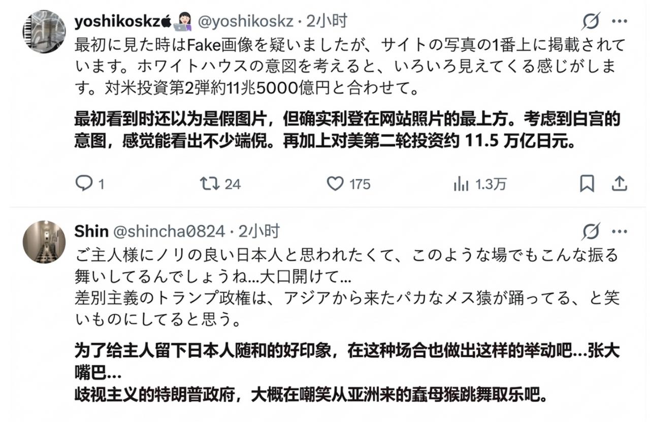 高市访美不出意外的话,将给日本、乃至世界留下了历史“遗产”。 首先国际层面,高市的访美,让世界看到了标准的“谄媚”举止。见怪不怪,高市与特朗普的几次会面,犹如小鸟依人,尤其是近日的访美,除奉上巨额投资,其夸张的动作、扭曲的表情,将特朗普称赞为给世界带来和平的人,可以说高市把“谄媚”运用的炉火纯青,哄的特朗普满脸堆笑。“谄媚外交”,不出意外会成为高市留给世界最标准的历史“遗产”,尤其是面对特朗普时。 接下来高市访美给日本留下了什么,一张可以载入日本史册的照片。极度扭曲的日本首相与张力自如的美国总统,而且是由美国白宫对外发布的照片,即便登陆美国时代周刊也不为过。但这张照片,已经让日本社会坐不住了,日本政府紧急发布了一个由日方拍摄的访美视频欲为高市挽回颜面,但日本政府好像忘了,这张照片早已在世界各地传播出去,这应该就是高市访美留给日本的一个无法释怀的“文化遗产”。