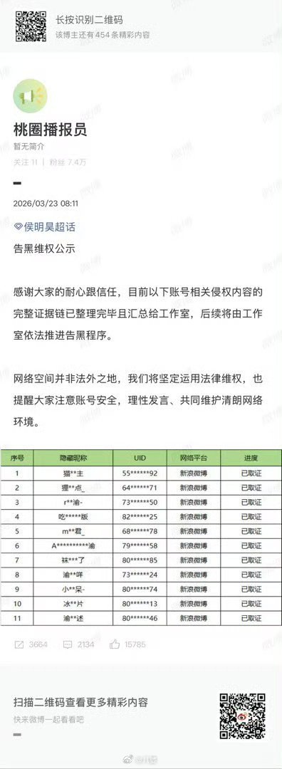 侯明昊告了梓渝粉丝 现在粉圈的瓜都要靠法律来收场了?侯明昊告梓渝粉丝,梓渝那边也同步反诉,从造谣P图到批皮引战,乱象全暴露在台面上。只想说,追星别丢了底线,网络不是法外之地,别等收到传票才后悔。