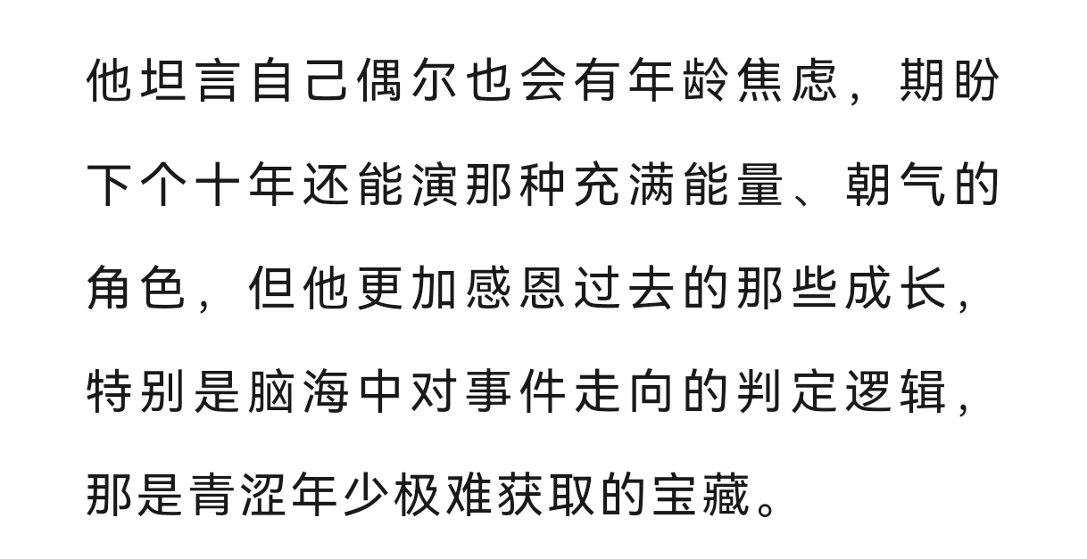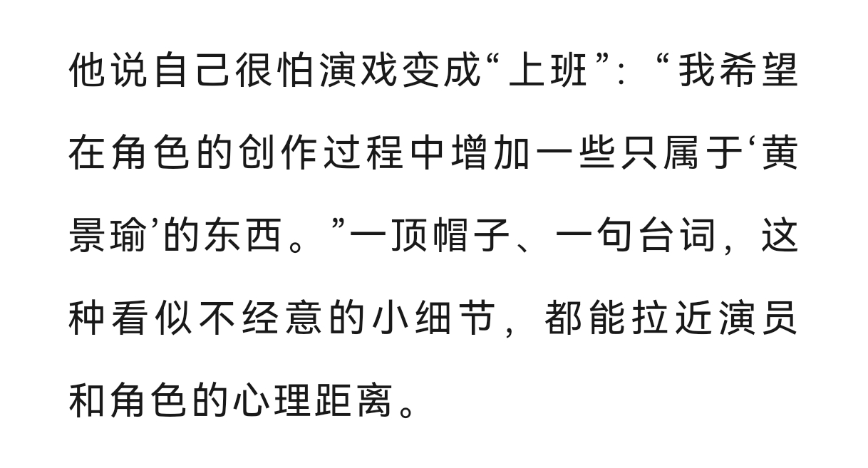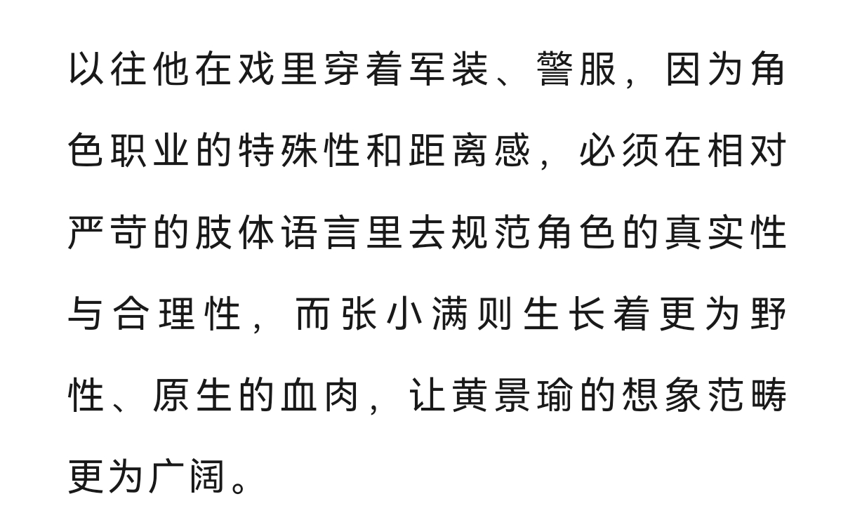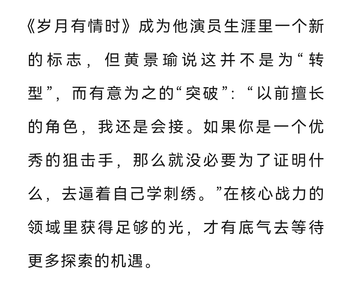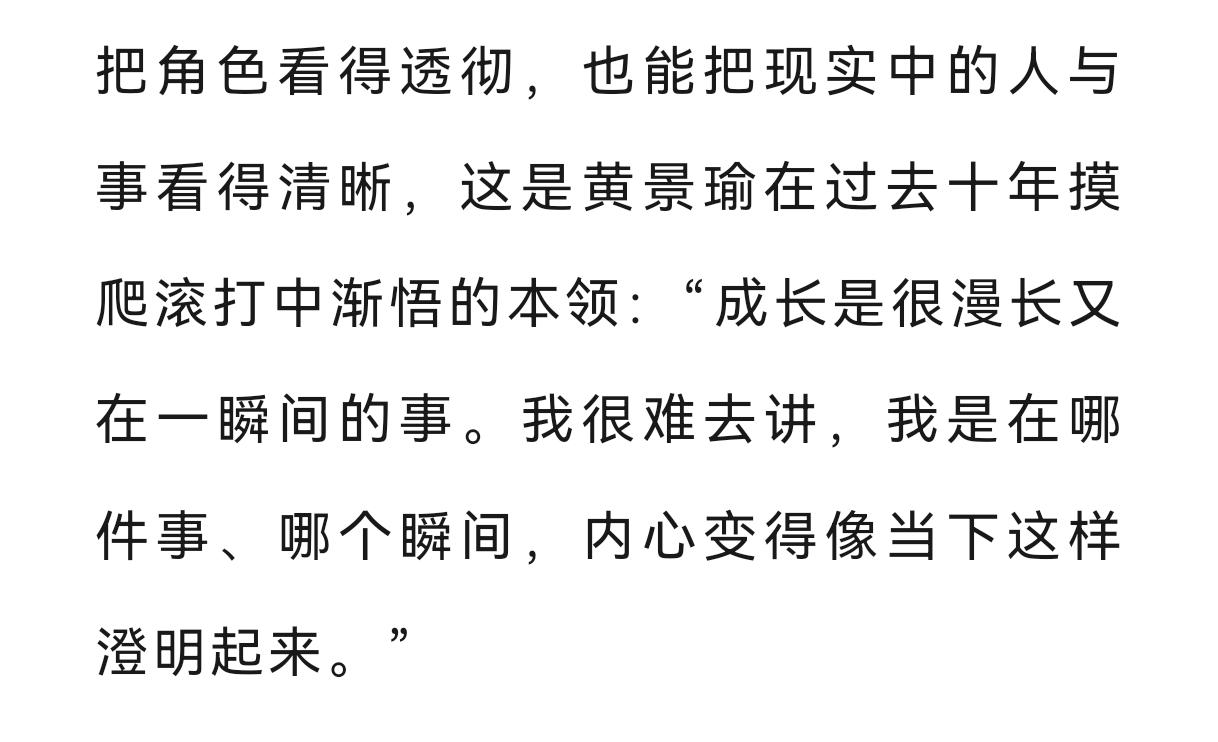 黄景瑜︱《时装男士》︱采访文字稿2026年3月开季封面故事节选①关于成长:内心的舒适度比表面更重要,成长是很漫长又在一瞬间的事,十年里几乎每一天都充实、忙碌,当时间一下子到了这个节点,回头看,又发现从前害怕的、纠结的那些情绪背后,居然一件具体的事也想不起来。②关于转型:如果你是一个优秀的狙击手,那么就没必要为了证明什么,去逼着自己学刺绣③关于表演:我希望在角色的创作过程中增加一些只属于‘黄景瑜’的东西④关于角色:张小满生长着更为野性、原生的血肉,让黄景瑜的想象范畴更为广阔。其实我一直觉得,黄景瑜素人出道走到一线,成功的秘诀就是基于他对自己,对角色有足够精准的理解和把握,在他擅长的领域做到Top,再去其他题材里试试水深,既是一种稳扎稳打的战术,也体现了黄景瑜对自我认知的精准,而不是为了突破而突破,在一块板子上砸出一堆浅浅的坑,没有一个领域能击穿。他的入行是偶然,他的成功则是必然