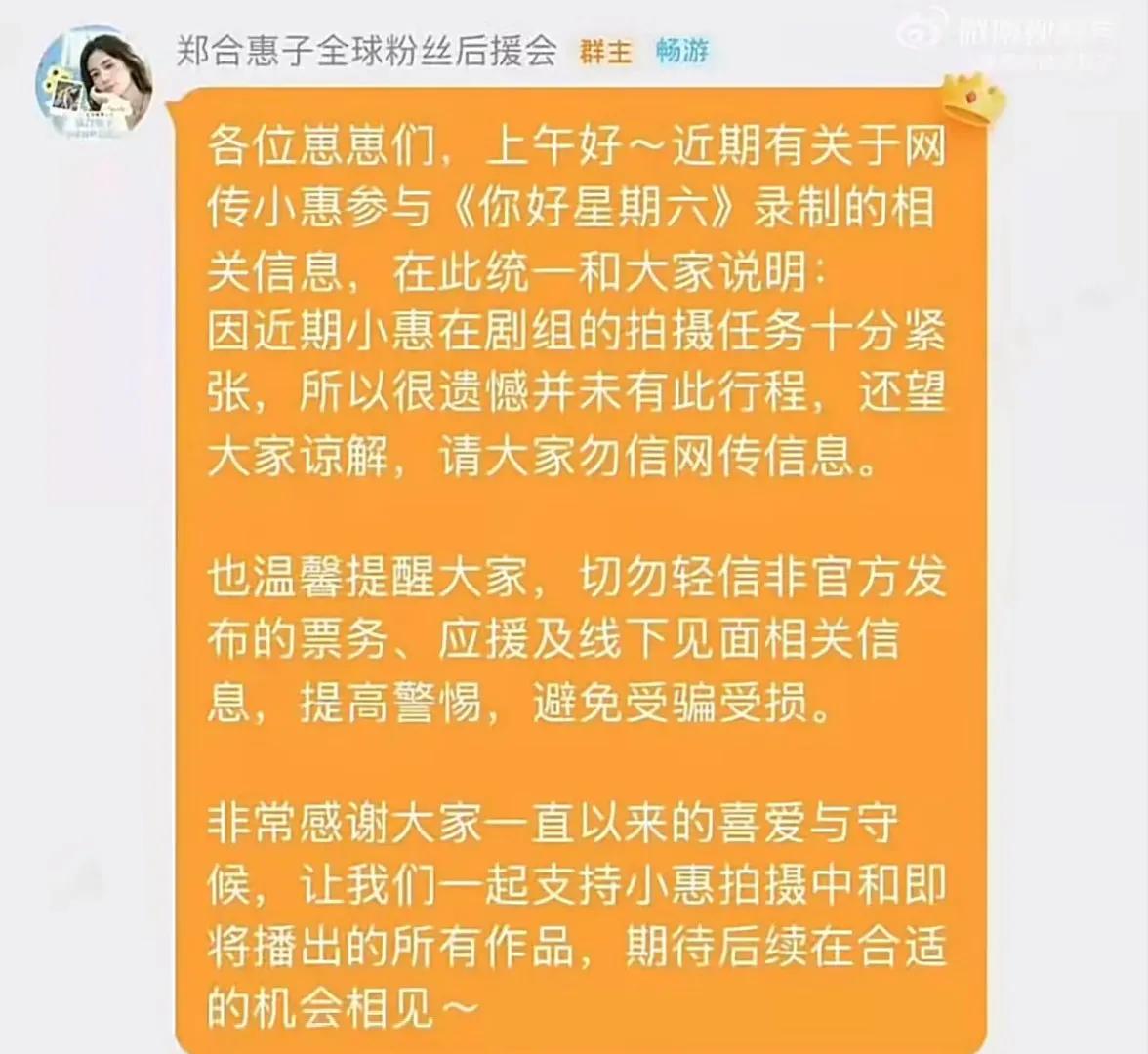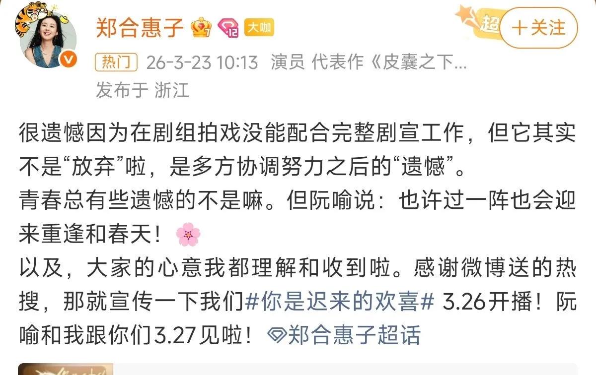 郑合惠子因为在拍戏放弃去hi6剧宣,工作室被粉丝骂了。 郑合惠子因在拍摄古装剧《将门独后》,剧组拍摄任务紧张,无法参与其主演新剧《你是迟来的欢喜》在《你好星期六》的宣传活动。 部分粉丝认为hi6作为头部综艺,是郑合惠子的重要曝光机会,对于她这种咖位,好六的剧宣机会应该珍惜的。且郑合惠子《将门独后》中担当的是女二,戏份不多,去hi6宣传比拍剧强啊,质疑其团队协调能力不足、主次不分浪费资源。 随后郑合惠子发微博回应,表示这不是放弃,而是多方协调努力之后的“遗憾”,大家的心意都理解和收到啦,并宣传《你是迟来的欢喜》定于3月26日开播。 能理解粉丝为什么这么生气,上星综艺的影响力远比你想象的大,何况还是个周播节目。很多人看到嗨6的剧宣会回去搜一下切.片,好看就追,不好看就忽略。 剧宣也是艺人的工作之一,这个女主剧还是芒果的,不去剧宣,宣传直接断掉工作室怎么想的?自己的女主剧都不调时间去参加,男主一个人也宣不了吧,那观众还嗑什么……不管去了有没有用,上节目露个脸总比没去好太多了。