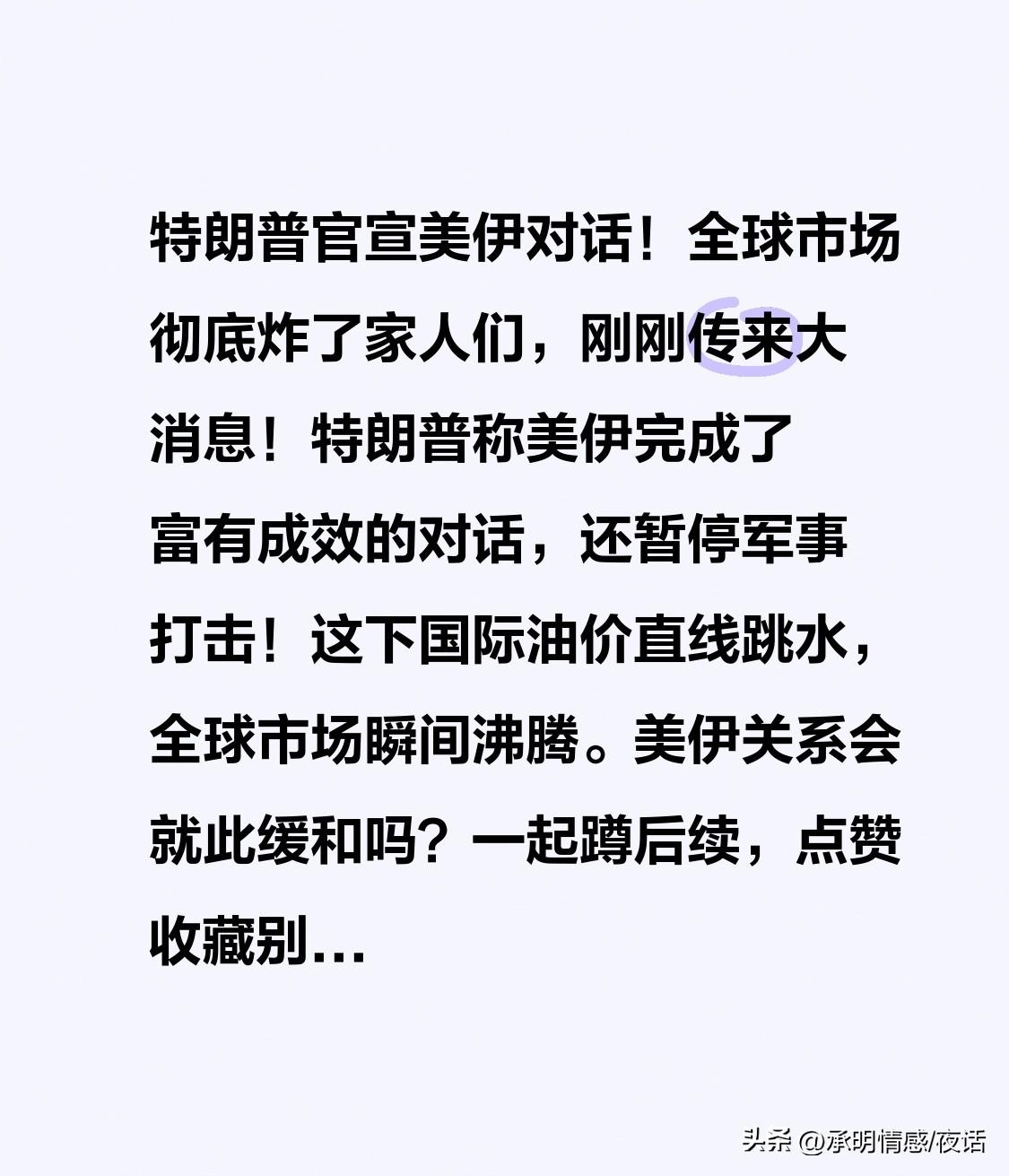特朗普官宣美伊对话,全球市场“炸锅”! 家人们,刚有大消息!特朗普表示美伊进行了富有成效的对话,还暂停军事打击。国际油价直线跳水,全球市场瞬间沸腾。美伊关系会缓和吗?蹲后续,点赞收藏别错过!