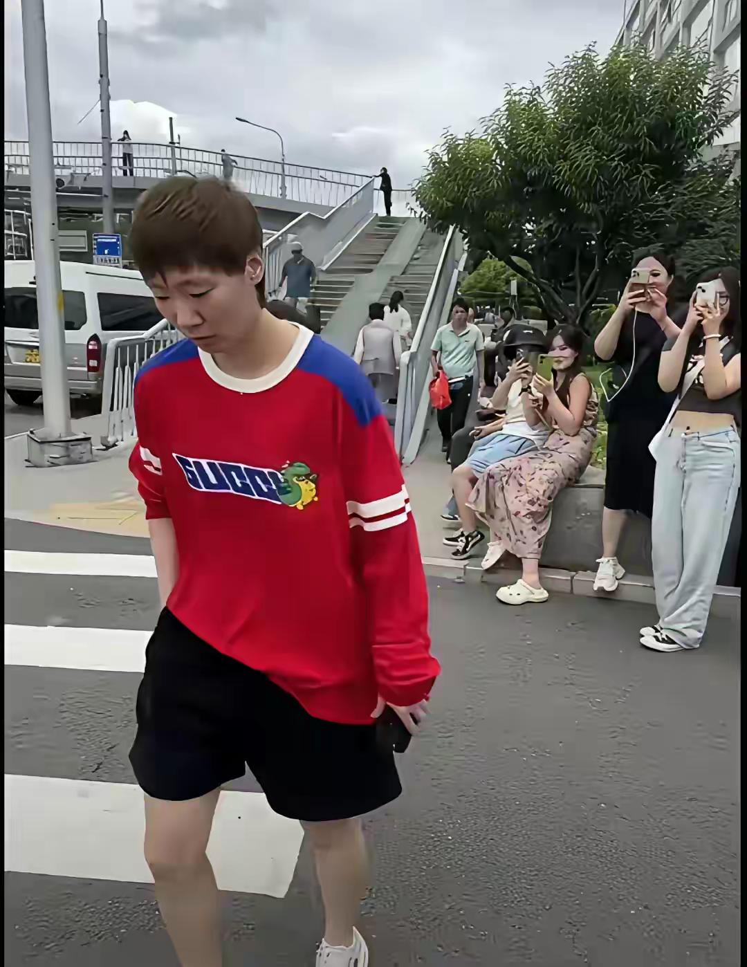 【王曼昱穿着红衣服,被路人拍照】这是国家体育总局训练局,北京天坛东路50号。王曼昱身着红色上衣,正从训练局大门走出,被等候的球迷用手机拍照记录。 这身穿搭给人的感觉是休闲随性、活力满满,还带着一点运动潮范儿。 色彩与氛围:正红色主调亮眼吸睛,蓝白拼接增添清爽感,整体氛围活泼又有朝气,很有夏日街头的轻松感。 风格定位:宽松的卫衣+短裤,是典型的休闲运动风,舒适自在,没有刻意的精致感,透着一股随性洒脱的劲儿。 气质融合:运动单品的舒适感,加上红色的活力,中和了运动装的单调,既有运动员的利落感,又不失街头潮流的轻松氛围。 简单说,就是舒服、亮眼、随性又有活力,日常出街很吸睛,还显得人精神饱满。