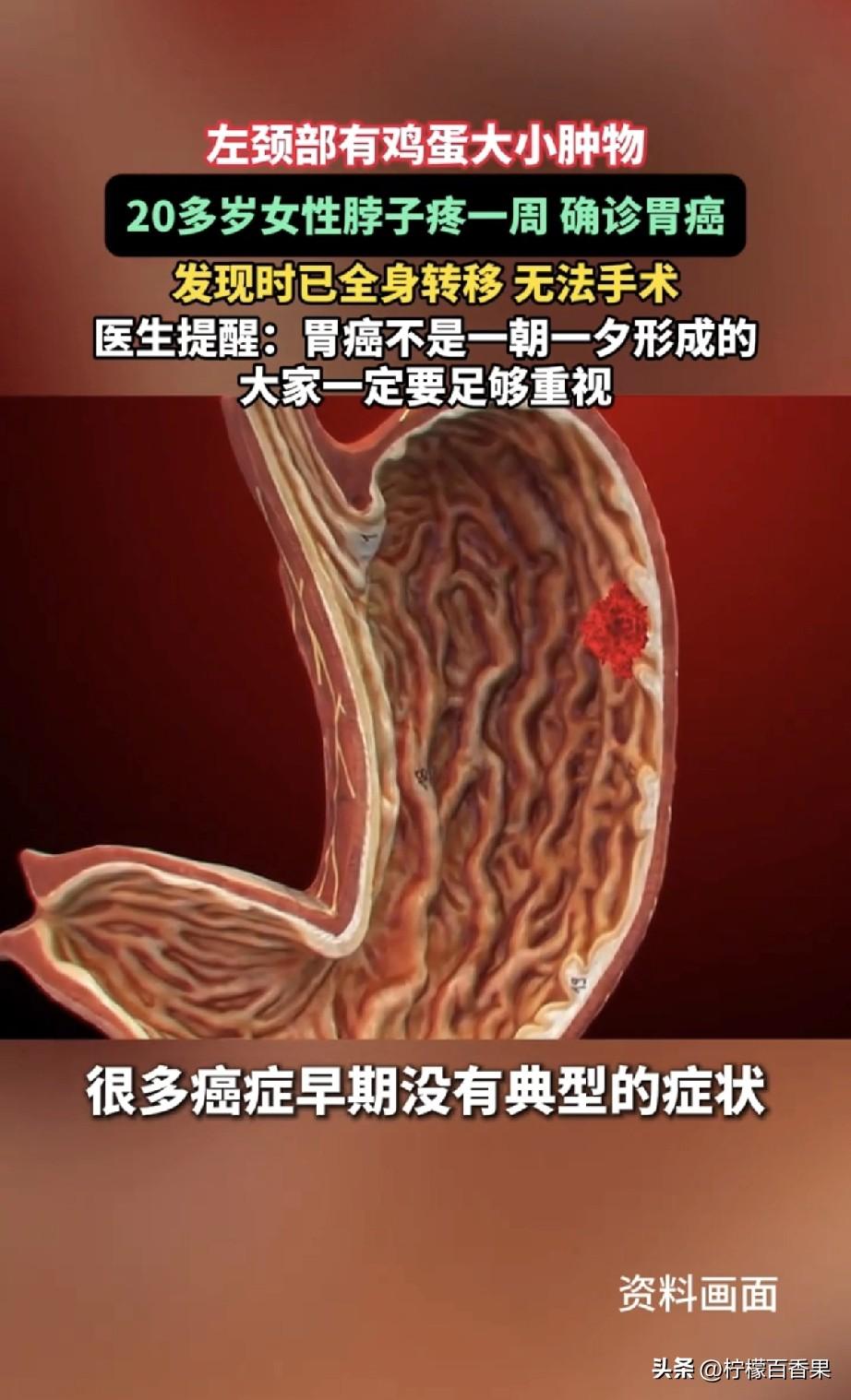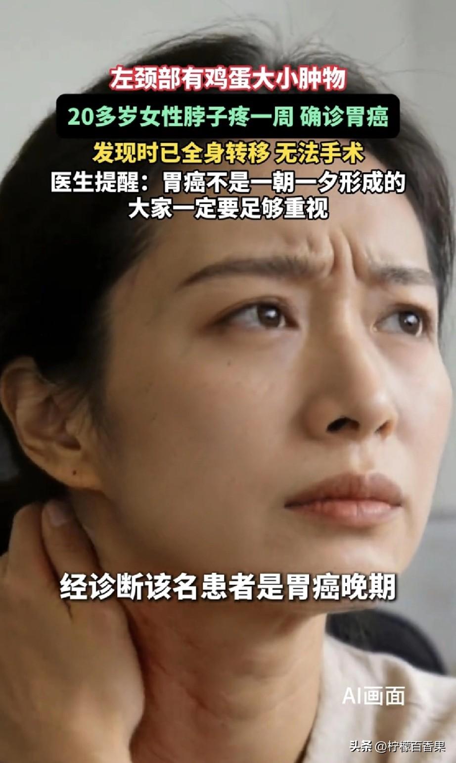 真的看完心里一阵发紧,东莞这位20多岁的姑娘,只是左脖子肿疼了一周,本以为是小毛病忍忍就过,结果一查竟是胃癌晚期,已经全身转移,连手术的机会都没了。 最让人揪心的是,她之前完全没有胃痛、胃胀这些典型的胃部不适,吃饭、排便都和往常一样,谁能想到,脖子上那点不起眼的肿痛,竟是身体发出的致命警报。 总觉得癌症离年轻人很远,总以为“没胃痛就没胃病”“脖子疼就是落枕”,可病魔从来不会看年龄下菜碟。我们总忙着工作、忙着照顾家人,总把身体的小信号当成“小题大做”,总想着“等有空再去检查”,可健康从来等不起。 那些被我们忽略的小毛病:颈部莫名肿块、不明原因的消瘦、持续的乏力、反复的胃胀反酸,都不是身体在“矫情”,而是在拼命求救。 别再侥幸,别再硬扛,身体哪里不舒服,一定要及时去医院。早检查、早发现,才是对自己、对家人最实在的负责。 愿我们都能好好照顾自己,别让小病痛,拖成无法挽回的遗憾