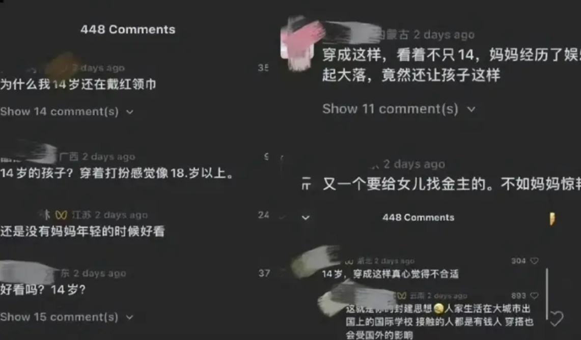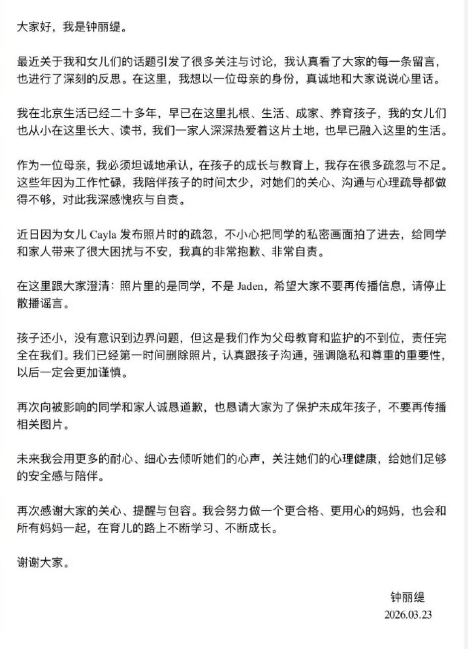 钟丽缇为女儿道歉,承认自己疏于管教,考拉也在视频中希望大家轻点批评,对于恶评会选择不看。 因为一张照片,钟丽缇的女儿上了热搜,照片中她和朋友一起拍照,完全没有顾及背后有人坐在马桶上,遭到网友质疑。 但这并不是考拉第一次惹争议,2024年,考拉14岁生日时,晒了几张自己的性感美照,其装扮完全不像一名初中生,有不少网友评论她装扮过于成熟,考拉很生气,嘲讽网友14岁还没有***,然后突然莫名其妙怼红 领 巾。 最近不少网友扒出这段,结合不顾及她人隐私进行批判。 一般情况下,在社交平台放照片时,都会比较谨慎,考拉这次发的照片,如果稍微注意点,或者把后面的人打个虚影,恐怕都不会引起争议。但她又不可能没注意到,因为太明显的,那就只有一种可能,她可能并不觉得有什么问题,涉及不到隐私这么大的帽子。 钟丽缇说,她已经在北京生活了20多年,两个女儿也在北京上学,言外之意,孩子只是不懂事,没有想那么多,但该说不说,考拉和内地中学生差别还是很大,至少很多内地中学生家长,不会允许孩子打扮成这样吧。 前有小S的二女儿说她的母语是英语,后有钟丽缇女儿三番两次惹争议,可能台湾家长的教育方式,和内地真的有很大区别吧。