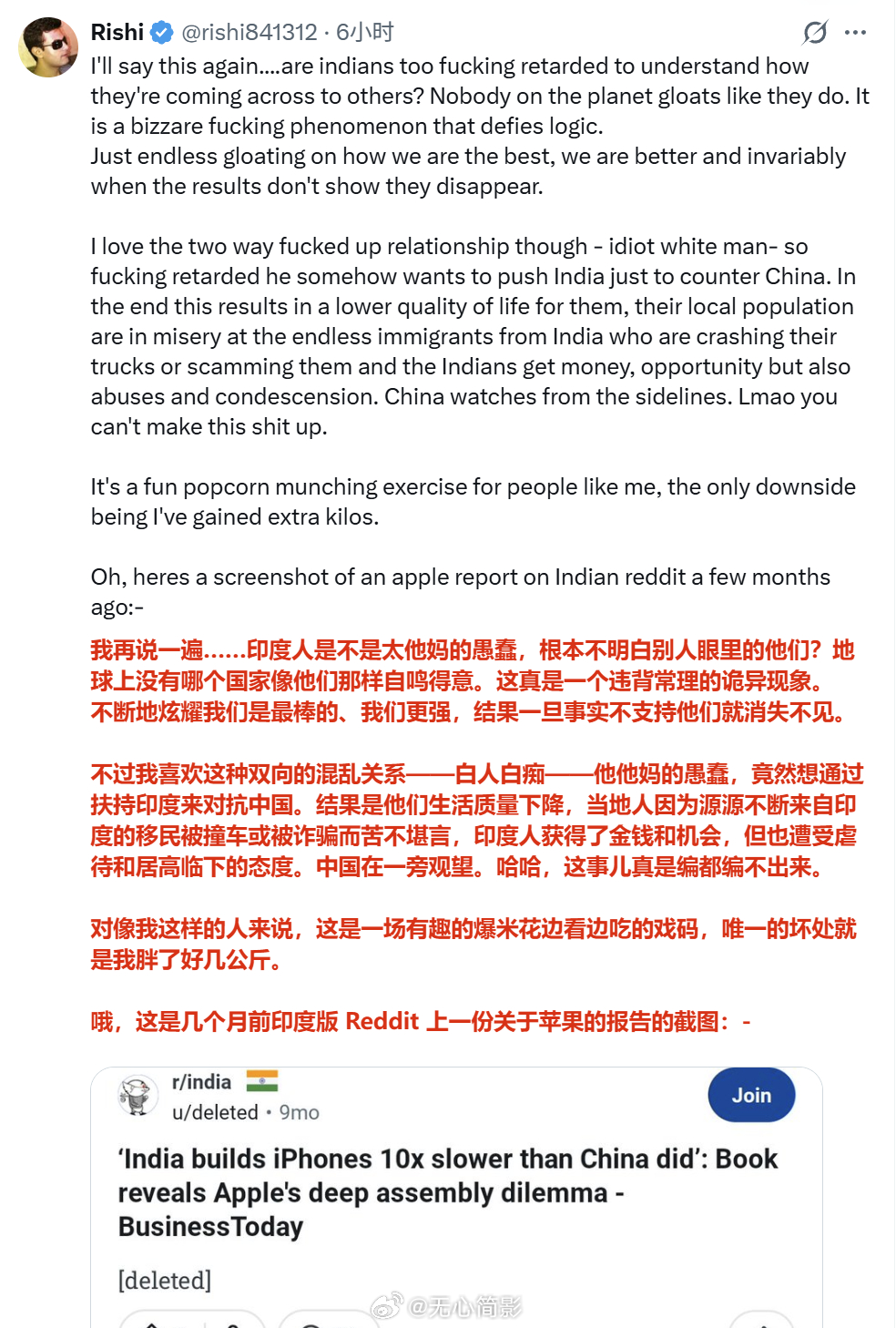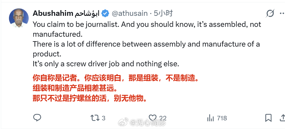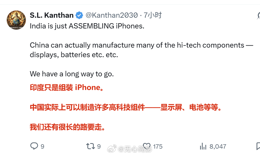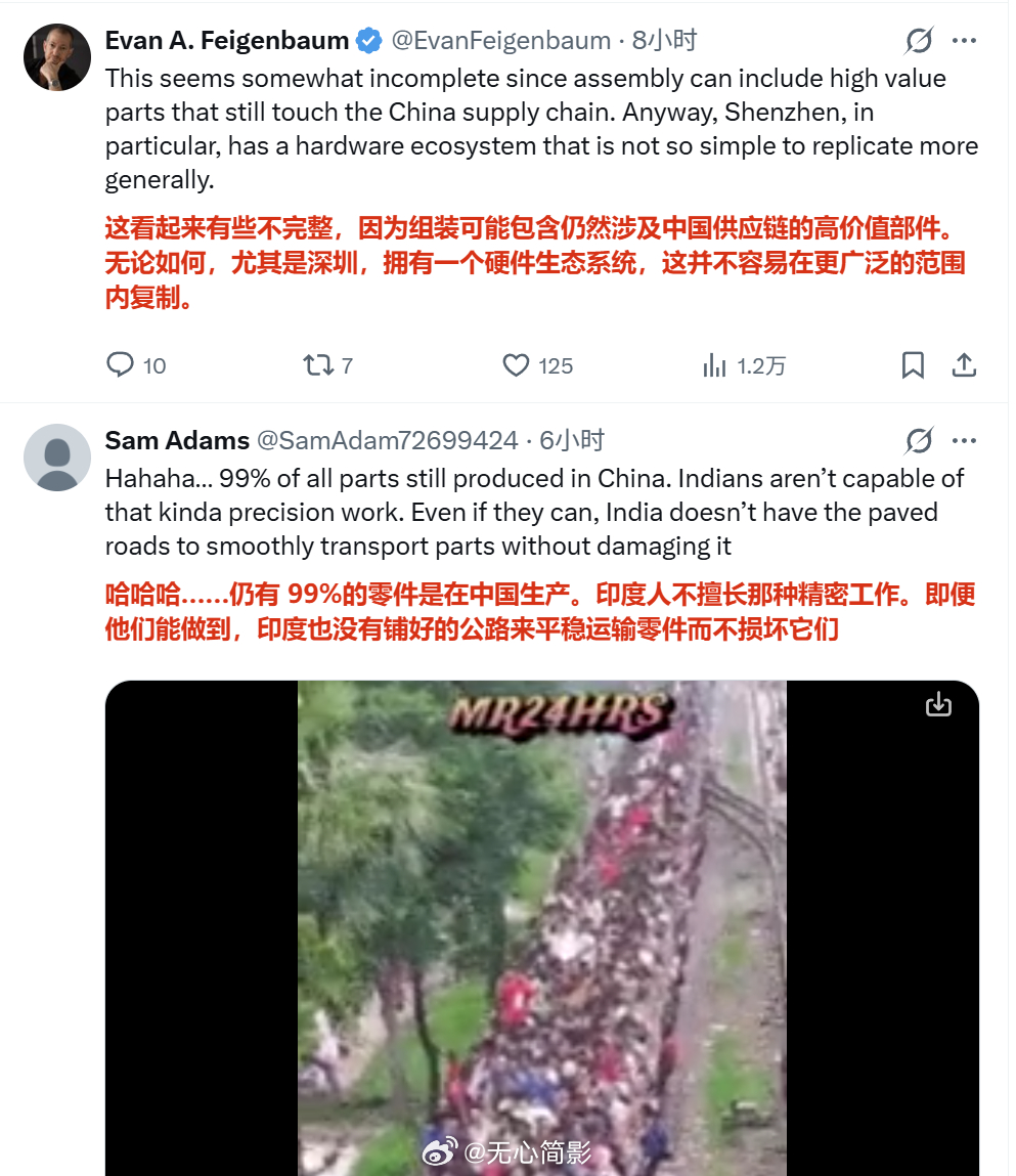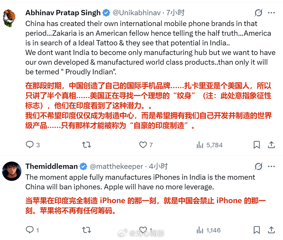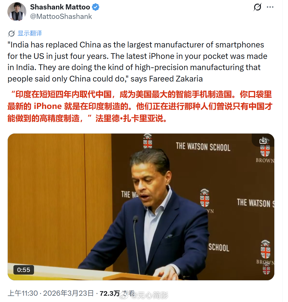 印度裔美国知名记者法里德·扎卡里亚说:“印度在短短四年内取代中国,成为美国最大的智能手机制造国。你口袋里最新的 iPhone 就是在印度制造的。他们正在进行那种人们曾说只有中国才能做到的高精度制造。”结果评论区翻车了,连印度人都不这么认为……
