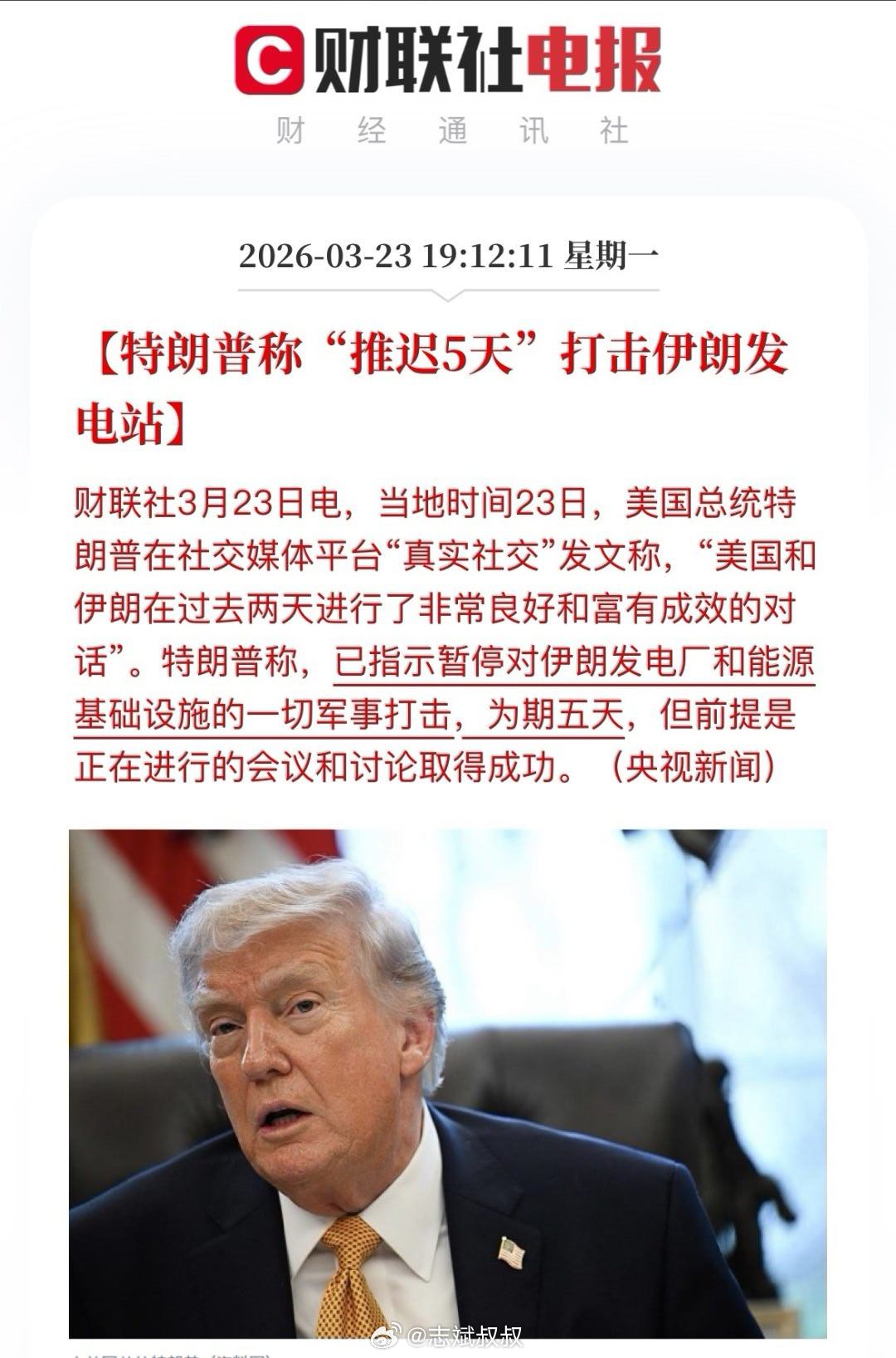 特朗普说美伊已经对话。特朗普说推迟5天打击伊朗。但伊朗媒体表示,美伊之间既没有直