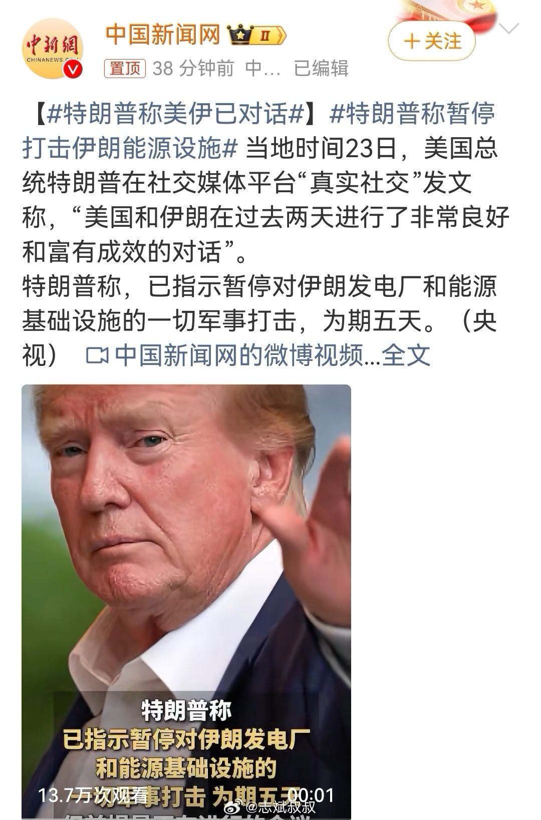 特朗普说美伊已经对话。特朗普说推迟5天打击伊朗。