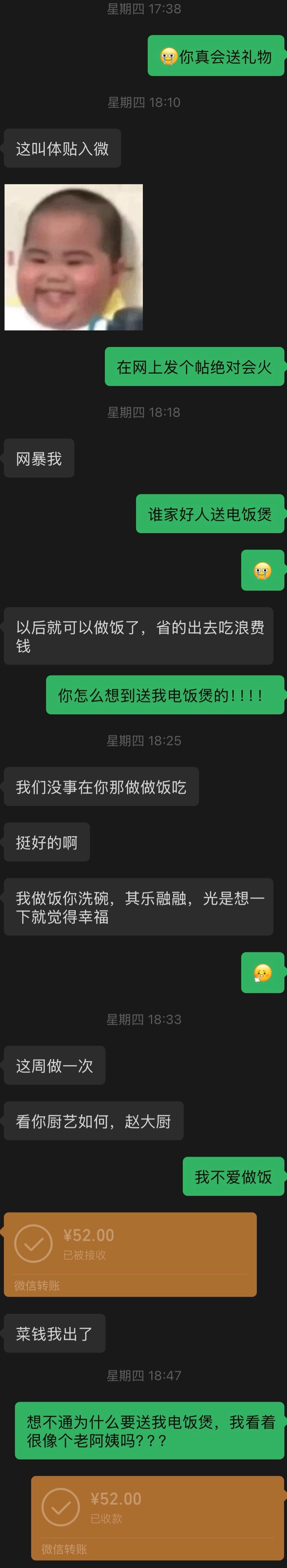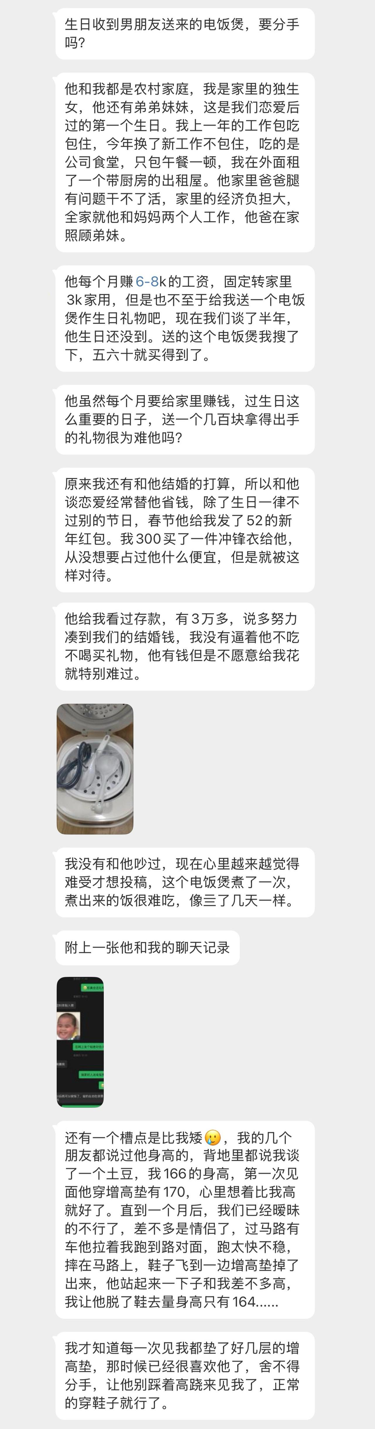 女孩过生日,男朋友送个几十块的电饭锅,女孩很失望。求助网友,问要不要分手。其实不用问,女孩心里面应该有主意了。 女孩说她之前的工作包工作包吃包住,换的工作只包一个中餐,晚饭得自己解决。男朋友送电饭锅给她。是希望她晚上能自己煮饭吃,这样不用叫外卖,也可以省一点钱。 她男朋友家负担比较重,每个月收入 6000 左右,要打 3000 回家补贴家用,给弟弟妹妹,还有生病的父亲。 女孩和这个男生在一起,觉得这个男生不够高不够帅,有一次约会走路太快竟然把增高鞋垫甩出来了,让女孩哭笑不得。 这个男孩是一个实在人,日子过得紧巴,没有那么多花花肠子,给女孩提供不了她想要的那种情绪价值。甘蔗没有两头甜。如果选择和这样的男孩在一起,势必就没有那么浪漫潇洒。
