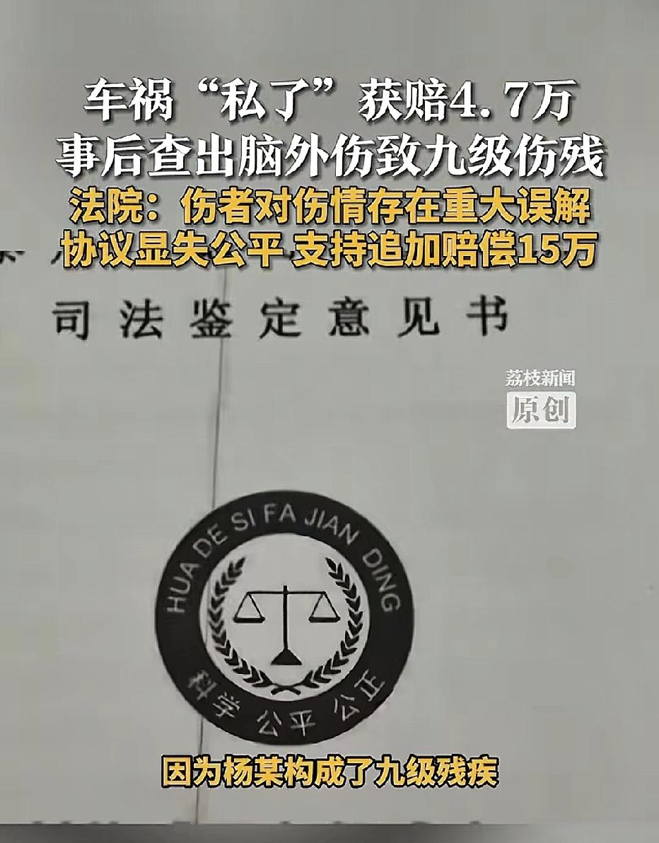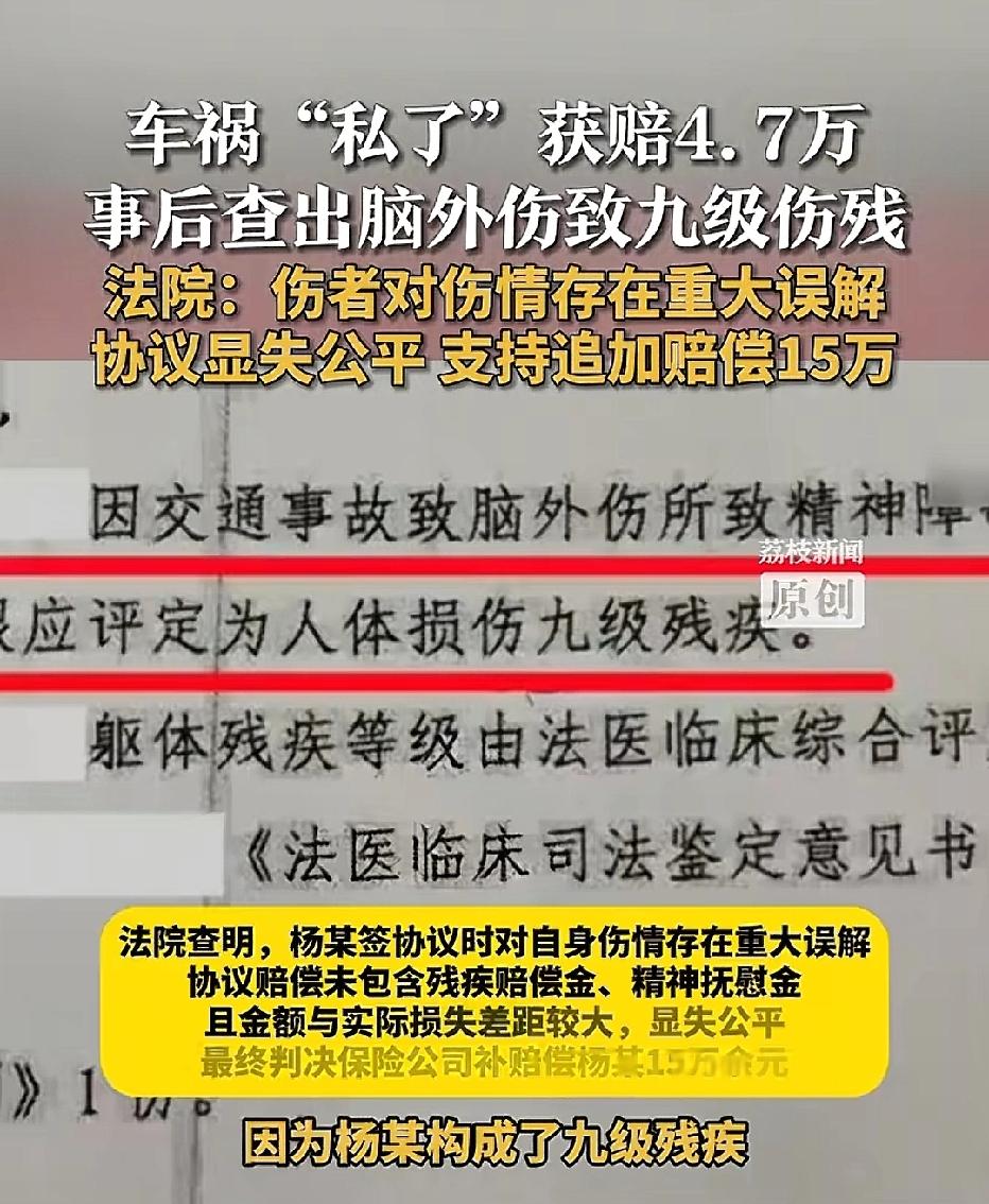 江苏泰州,男车主驾车与骑三轮车的男子发生交通事故,男子受伤后双方私了,男子获赔47000元,没想到,事后男子被鉴定为九级伤残,他认为赔偿过低,要求追加赔偿被拒,男子起诉到法院,法院判决追加赔偿15万。 事发当天,车主陈某当时开着汽车出行,在行驶途中,与骑电动三轮车的杨某发生了激烈碰撞。 事故造成杨某当场受伤,被紧急送往医院抢救。 经交警部门现场勘查和认定,陈某负事故的全部责任。 杨某后续所有的损失,都应该由陈某来承担。 陈某在处理事故时,心态其实是比较平稳的。因为他的车辆购买了齐全的保险。 也正是因为有这份保险做后盾,陈某在后续的协商中态度比较积极。 杨某住院期间,双方都希望能尽快把事情解决,不想过多纠缠。 于是陈某、杨某三方,以及陈某投保的保险公司,坐下来进行了协商。 考虑到陈某有保险在身,赔付能力没问题,杨某也想早点拿钱治病,双方最终达成了“私了”协议。 按照约定,陈某和保险公司共同向杨某赔付了47000元。 这笔钱当时就打到了杨某账上,杨某觉得事情就这样结束了,签了字,以为从此相安无事。 然而,命运却给杨某开了一个残酷的玩笑。 私了之后,杨某回家休养,本以为能慢慢恢复,却发现身体状况越来越差。 他开始频繁地恶心、呕吐,同时伴随着严重的精神障碍,情绪极度不稳定,时而暴躁时而抑郁,晚上失眠睡不着,白天也无法集中精力。 家人觉得不对劲,赶紧带他去医院做了全面的脑部检查和司法鉴定。 结果出来后,所有人都惊呆了:杨某因本次事故的脑部撞击,引发了严重的精神障碍,经专业机构鉴定,构成了九级伤残。 这是当初双方在签私了协议时,完全没有预料到的严重后果。 大家原本以为只是普通的外伤,谁知道留下了那么严重的后遗症。 面对这突如其来的九级伤残,杨某的生活和治疗成本瞬间翻倍。 当初拿到手的47000元赔偿款,很快就被医疗费和后续各种开销花光了。 面对后续巨额的康复费用和伤残带来的生活影响,杨某不得不再次联系陈某和保险公司,希望能追加赔偿。 但是,陈某和保险公司却拒绝了杨某的请求。 陈某表示:当初已经签好协议,钱也赔给你了,白纸黑字签字了,现在反悔不行。 保险公司也以“协议已履行完毕”为由,拒绝追加赔付。 走投无路之下,杨某只能选择起诉,将陈某和保险公司一起告上了法庭。 法院经过审理,支持杨某的诉求,判决追加保险公司赔偿15万。 《民法典》第147条:基于重大误解实施的民事法律行为,行为人有权请求撤销。 法院审理认为,杨某当时签协议时,还没有做伤残鉴定,也不知道自己会出现精神障碍和九级伤残。 他对伤情的严重程度存在严重、客观的错误认识,属于法律上的“重大误解”,因此有权要求撤销或变更原协议。 《民法典》第151条规定:一方利用对方危困状态,致使协议显失公平的,受损害方可请求撤销。 47000元连杨某最初的医疗费都不够,更无法覆盖伤残赔偿金、精神抚慰金和后续长期治疗费用。 双方利益严重不对等,因此法院认定该协议显失公平,应予调整。 《交强险条例》第21条规定:车辆投保交强险的,发生事故后由保险公司在责任限额内先行赔偿。 陈某负全责,且事故在保险有效期内,因此保险公司必须承担赔偿责任,法院判决的15万元完全属于保险赔付范围,陈某个人不需要额外掏钱。 这事件也给所有人提个醒,如果伤情较重,务必做完伤残鉴定,预估完整损失后再谈判,避免因重大误解陷入纠纷。 对于伤者,如果因重大误解签了不公平协议,只要证据充分,依然可以通过法律途径反悔追讨,维护自身合法权益。 对此你怎么看?