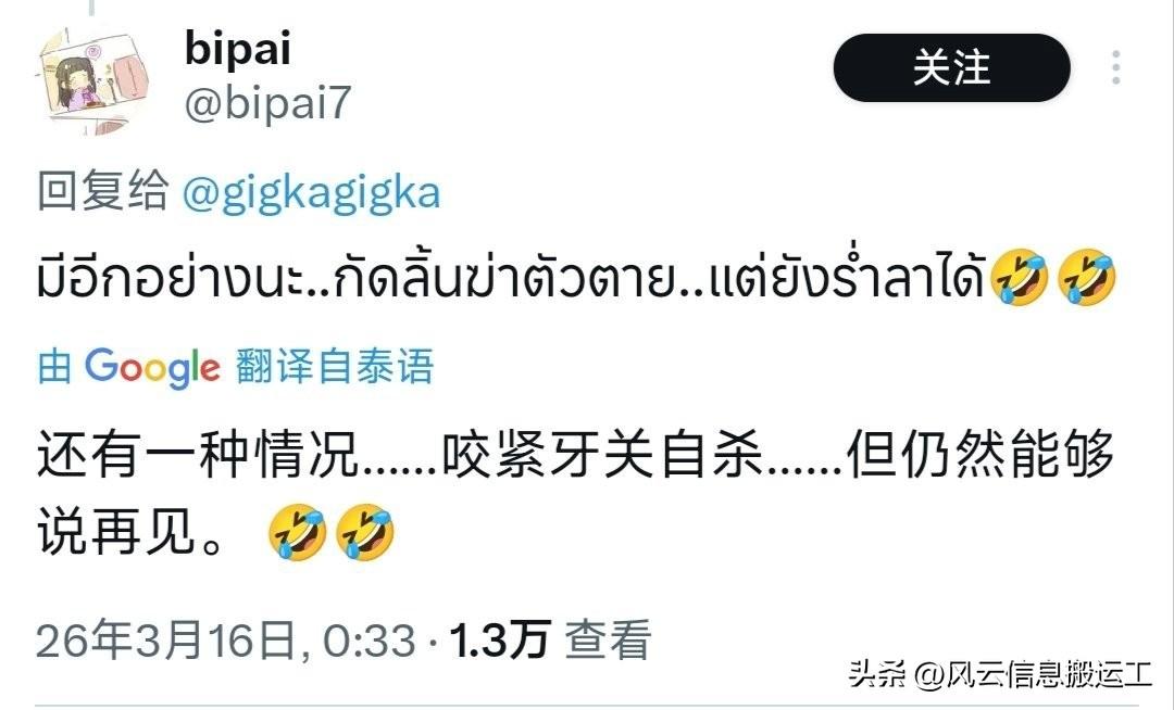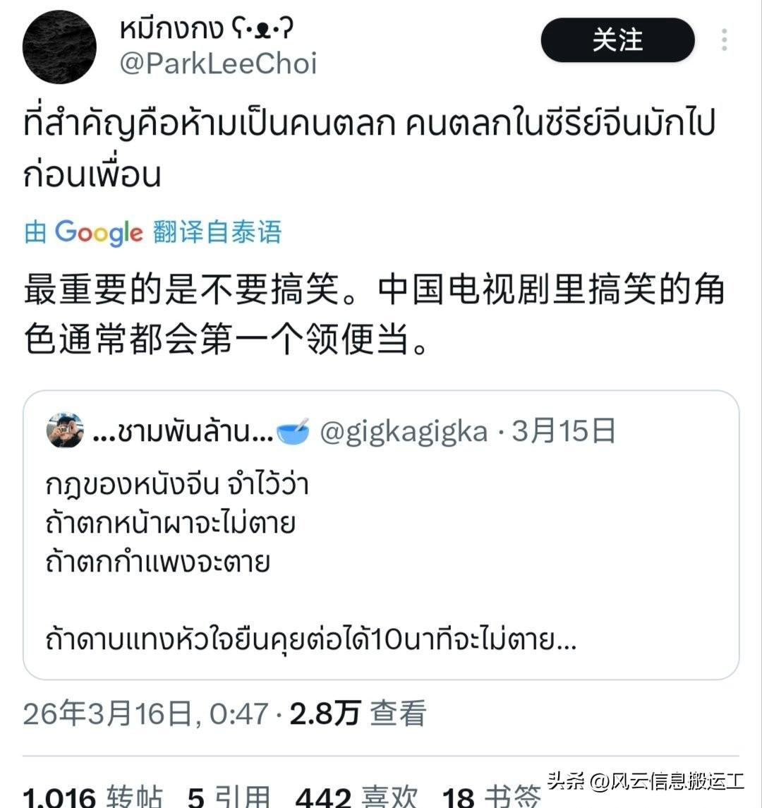 泰国网民已经总结出了中国影视剧的规律 如果你从悬崖上掉下去,你不会死。 如果你从墙上掉下来,你会死的。 如果被刺中心脏后还能站立说话10分钟,你就不会死。 如果你的头撞到墙上,你会立即死亡。 因此,不要靠近城墙;在那里丧命比在战阵中丧命更容易。