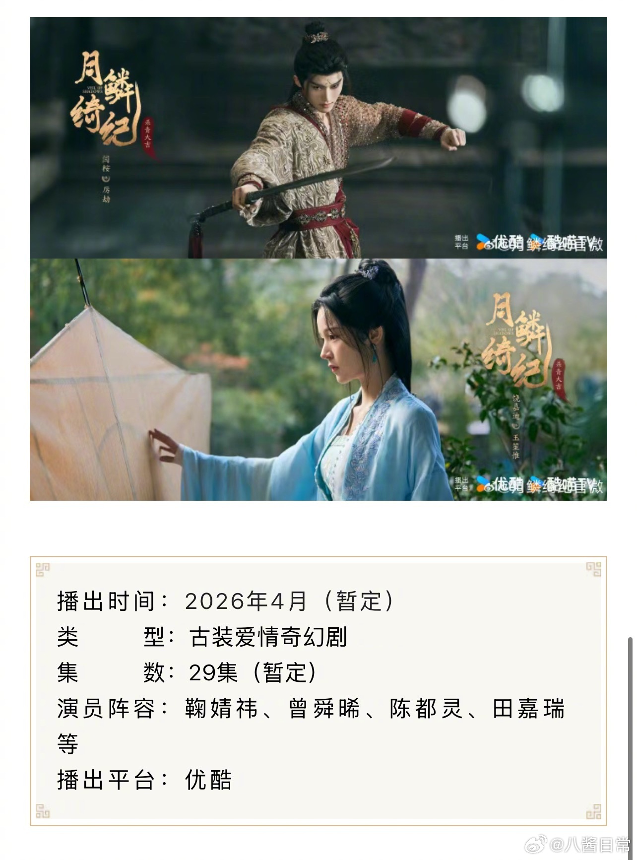 鞠婧祎、曾舜晞、陈都灵、田嘉瑞《月鳞绮纪》预计4月1日👖开播