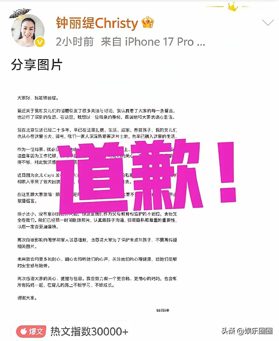 大家好,我是钟丽缇。 最近关于我和女儿们的话题引发了很多关注与讨论,我认真看了大家的每一条留言,也进行了深刻的反思。在这里,我想以一位母亲的身份,真诚地和大家说说心里话。 我在北京生活已经二十多年,早已在这里扎根、生活、成家、养育孩子,我的女儿们也从小在这里长大、读书,我们一家人深深热爱着这片土地,也早已融入这里的生活。 作为一位母亲,我必须坦诚地承认,在孩子的成长与教育上,我存在很多疏忽与不足。这些年因为工作忙碌,我陪伴孩子的时间太少,对她们的关心、沟通与心理疏导都做得不够,对此我深感愧疚与自责。 近日因为女儿 Cayla 发布照片时的疏忽,不小心把同学的私密画面拍了进去,给同学和家人带来了很大困扰与不安,我真的非常抱歉、非常自责。 在这里跟大家澄清:照片里的是同学,不是 Jaden,希望大家不要再传播信息,请停止散播谣言。 孩子还小,没有意识到边界问题,但这是我们作为父母教育和监护的不到位,责任完全在我们。我们已经第一时间删除照片,认真跟孩子沟通,强调隐私和尊重的重要性,以后一定会更加谨慎。 再次向被影响的同学和家人诚恳道歉,也恳请大家为了保护未成年孩子,不要再传播相关图片。 未来我会用更多的耐心、细心去倾听她们的心声,关注她们的心理健康,给她们足够的安全感与陪伴。 再次感谢大家的关心、提醒与包容。我会努力做一个更合格、更用心的妈妈,也会和所有妈妈一起,在育儿的路上不断学习、不断成长。 谢谢大家。 钟丽缇 2026.03.23 @钟丽缇Christy