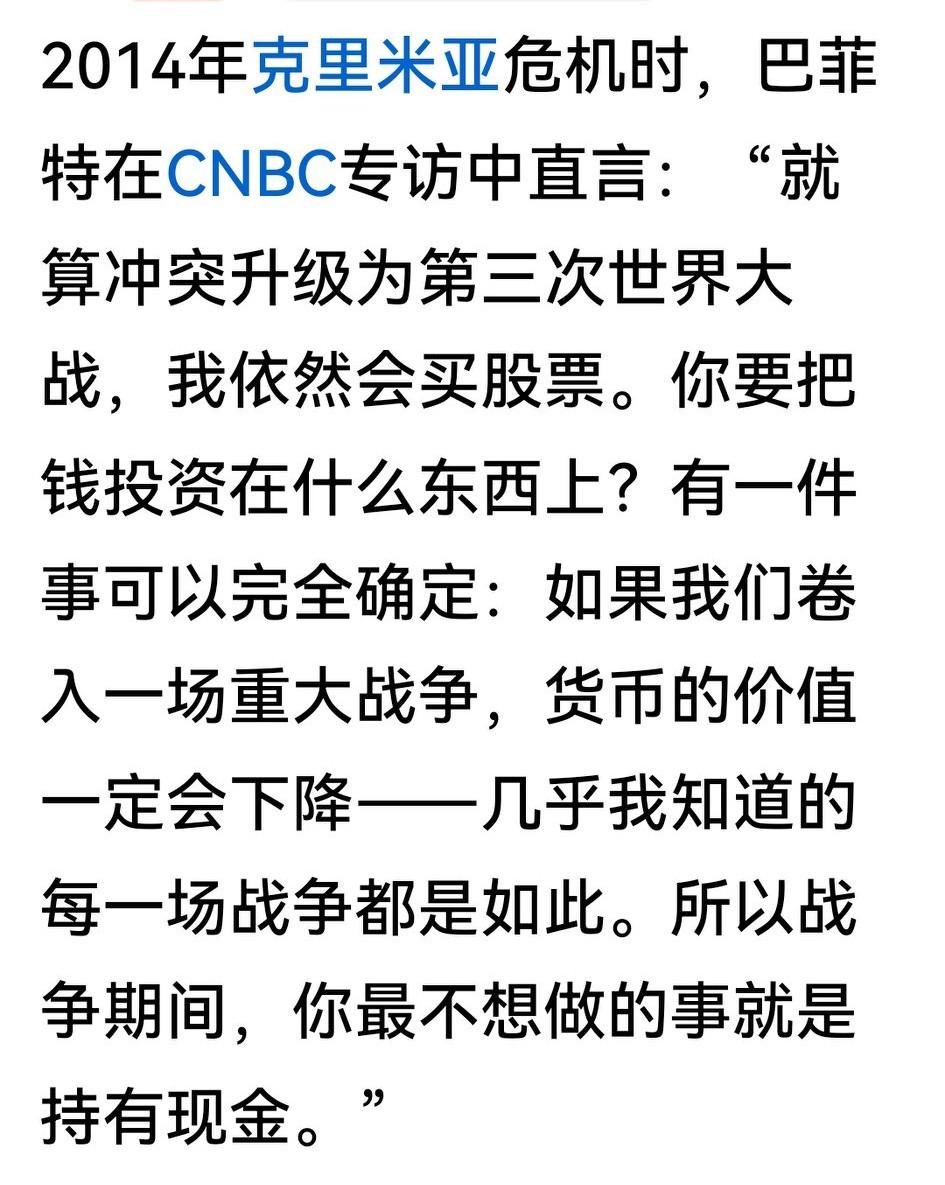 不看不知道,世界真奇妙!当下全球股市一片哀嚎,但斌转发巴菲特观点,喊买入股票。 但总转股神巴菲特观点:战争期间,最不想做的事就是持有现金,而是买入股票。仔细想来,战争发生,股市大跌,泥沙俱下,良莠皆倒,抄底错杀股的机会就来了。老巴的逻辑是,战争发生,货币价值一定下降,拿着钱就没意思了。股神之所以成股神,很大程度上是买股时机把握得好。 那么问题来了:大A断了脊椎,当下有没有底可抄?
