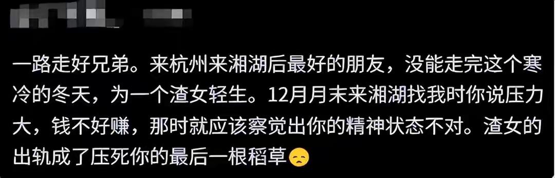 温州健身帅哥王雄威之死全网泪崩:拼命赚钱养家,妻子却在健身房被惯犯撬走,多少中年男人在沉默中崩溃? 他不是好吃懒做的人,相反他比谁都拼。工作认真,身材管理严格,俊朗的外表下藏着一颗不服输的心。可生活的重锤来得悄无声息,先是事业受挫,那份咬牙坚持的骄傲逐渐被现实磨平。没人想到,这竟是崩塌的开始。 曾经在健身房里挥汗如雨的身影渐渐消失,兄弟回忆里他变得沉默压抑。所有压力自己硬扛,一句“没事”背后全是咬碎的牙。直到去年底,他才第一次吐露委屈,可旁人只当是寻常抱怨,谁也没听出那话语里绝望的嘶喊。 压垮他的最后一根稻草,是妻子的背叛。那个他拼命跑业务想守护的家,背后早已被人撬开裂缝。更可悲的是,第三者竟是专盯已婚女性的惯犯,利用婚姻中的疲惫乘虚而入。王雄威在外负重前行,却不知最信任的人已在背后插刀。 发现真相的那一刻,他的世界彻底黑了。赚不到钱的挫败与至亲背叛的羞辱,像两座山压得他窒息。全网怒火涌向那对男女,可再多的谴责也换不回这个曾充满活力的生命。妻子至今沉默,仿佛一切与她无关。 其实悲剧早有征兆。他停更健身视频,变得寡言,在社交平台留下晦暗的句子——这些都是无声的求救。可我们总习惯性忽略,以为“忍忍就过去”。直到崩溃发生,才惊醒那些信号多么刺眼。 说风凉话的人永远不懂,一个中年男人的崩溃是场“沉默的流行病”。房贷、育儿、事业瓶颈、健康下滑……他们不敢喊累,不敢示弱,直到被最后一根稻草压垮。王雄威的悲剧撕开了这道口子:我们是否给身边人留了倾诉的出口? 这场悲剧没有赢家。第三者账号私密遁逃,妻子隐身网络,唯留破碎的家庭与无尽惋惜。若当时有人多问一句,若婚姻里多一分体谅,结局是否会不同?可惜生活没有如果。 愿他在天堂找回快乐与自由,愿生者学会在风暴来临前转身拥抱。每一个沉默的呐喊都值得被听见,每一次绝望的边缘都该有双手拉住。珍惜眼前人,或许是这场悲剧最痛的启示。 中年危机 婚姻底线 心理健康 (来源:根据网络事件及当事人亲友叙述综合撰写)