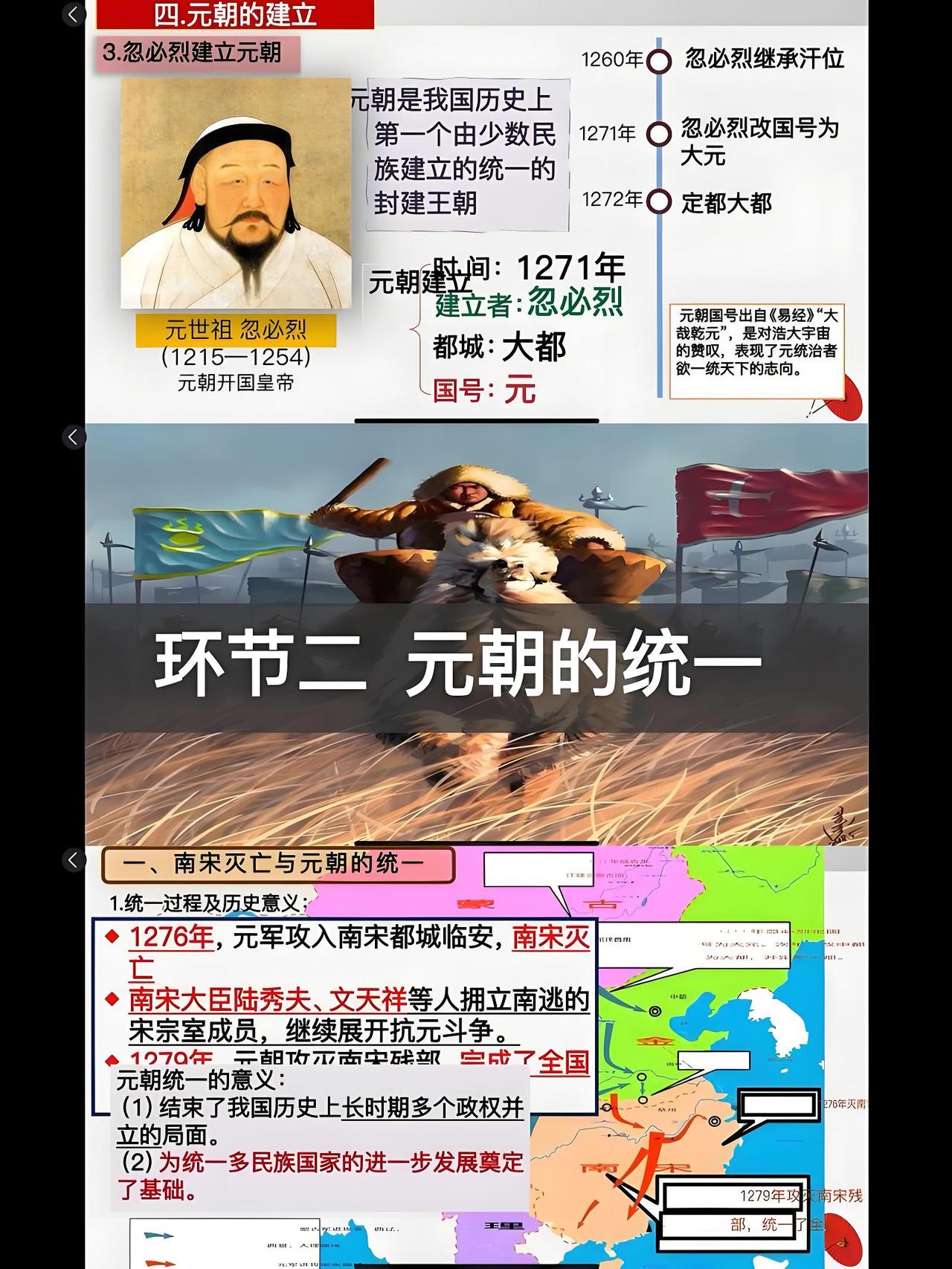 大家好,我是你们的历史科普博主,今天带大家穿越回13世纪,揭秘那个改变中国乃至世界历史进程的伟大帝国——元朝的建立故事! 元朝,作为中国历史上第一个由少数民族蒙古族建立的统一王朝,不仅打破了汉族王朝的传统统治模式,更开创了东西方交流的新纪元。那么,元朝是如何建立的?背后又隐藏着哪些鲜为人知的秘密?跟我一起来看看!历史 元朝的奠基人其实是成吉思汗(1162年—1227年),他本名铁木真,出生于蒙古草原一个普通部落。凭借非凡的军事才能和政治智慧,他统一了蒙古各部,创建了强大的蒙古帝国。 成吉思汗的成功秘诀不仅在于他卓越的骑射技能,更在于他善于整合各部落资源,实行严格的军纪和法令,打造了一支纪律严明、战斗力超强的铁骑军团。 成吉思汗去世后,他的子孙继续扩展版图。直到忽必烈(1215年—1294年)登场,元朝才真正成型。 忽必烈是成吉思汗的孙子,他不仅继承了祖父的军事才能,更有远见卓识。他在1271年正式建立元朝,定都大都(今北京),并于1279年彻底灭南宋,实现中国的再次统一。 强大的军事力量:蒙古骑兵的机动性和战斗力无与伦比,快速征服辽阔领土。 灵活的统治策略:忽必烈吸收汉文化,实行汉法与蒙古法结合,稳定社会秩序。 开放的对外政策:元朝是历史上第一个真正意义上的“世界帝国”,促进了东西方文化和经济交流。 元朝不仅结束了宋朝的分裂局面,实现了中国的统一,还促进了丝绸之路的繁荣,使东西方文明有了更多交流与融合。马可波罗的游记,就是元朝开放与繁荣的最好见证。 元朝的建立,是草原民族与中原文化碰撞融合的伟大篇章。它告诉我们,历史的进步往往来自于多元文化的交流与包容。希望今天的分享能让你更了解这段波澜壮阔的历史!