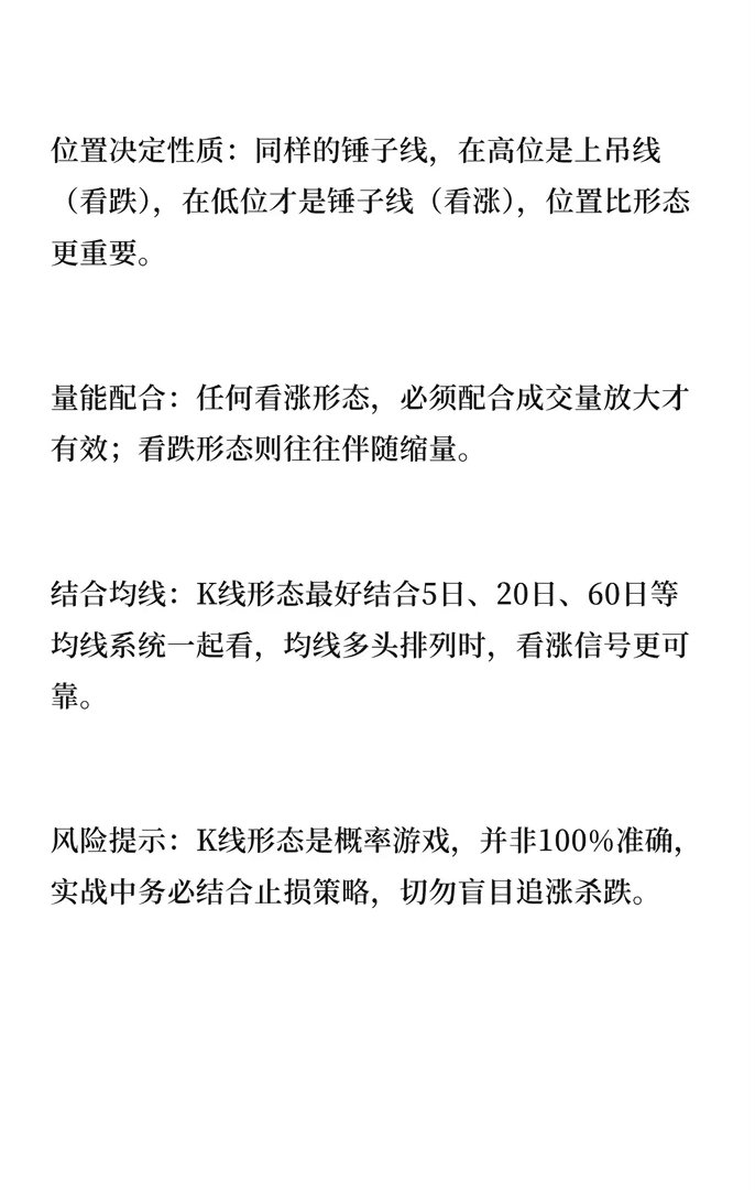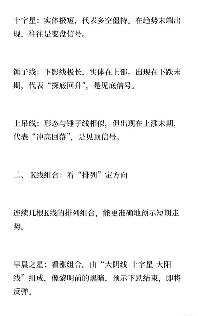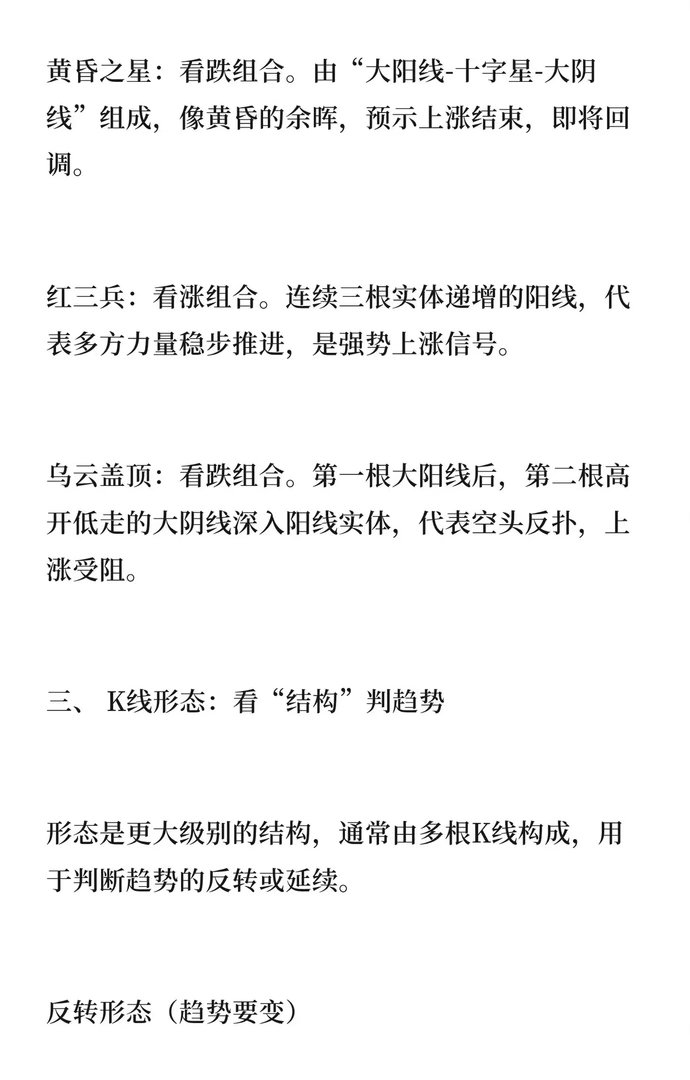📊 K线图形分析核心总结K线分析从单根K线、K线组合、K线形态三个维度判断市场多空博弈,核心要点如下:1. 单根K线:看影线识意图大阳/大阴线:实体长,代表趋势强劲(阳=多头掌控,阴=空头强势)十字星:实体极短,多空僵持,趋势末端常为变盘信号锤子线:下影线极长、实体在上,下跌末期=见底信号上吊线:形态同锤子线,上涨末期=见顶信号2. K线组合:看排列定方向早晨之星:大阴+十字星+大阳 → 看涨(下跌结束反弹)黄昏之星:大阳+十字星+大阴 → 看跌(上涨结束回调)红三兵:三根实体递增阳线 → 看涨(多方稳步推进)乌云盖顶:大阳后接高开低走大阴 → 看跌(上涨受阻)3. K线形态:看结构判趋势反转形态:头肩顶/底:经典反转(顶=见顶下跌,底=见底上涨)双重顶/底(M顶/W底):顶=上涨无力下跌,底=下跌企稳上涨中继形态:三角形整理:价格收窄蓄力(上升三角向上突破,下降三角向下突破)旗形整理:趋势短暂休整(上升旗形续涨,下降旗形续跌)4. 实战避坑指南位置优先:形态位置比形态本身更重要(高位锤子线=上吊线看跌)量能配合:看涨形态需放量,看跌形态常伴随缩量均线辅助:结合5/20/60日均线,多头排列时看涨信号更可靠风险提示:K线是概率游戏,需配合止损,勿盲目追涨杀跌