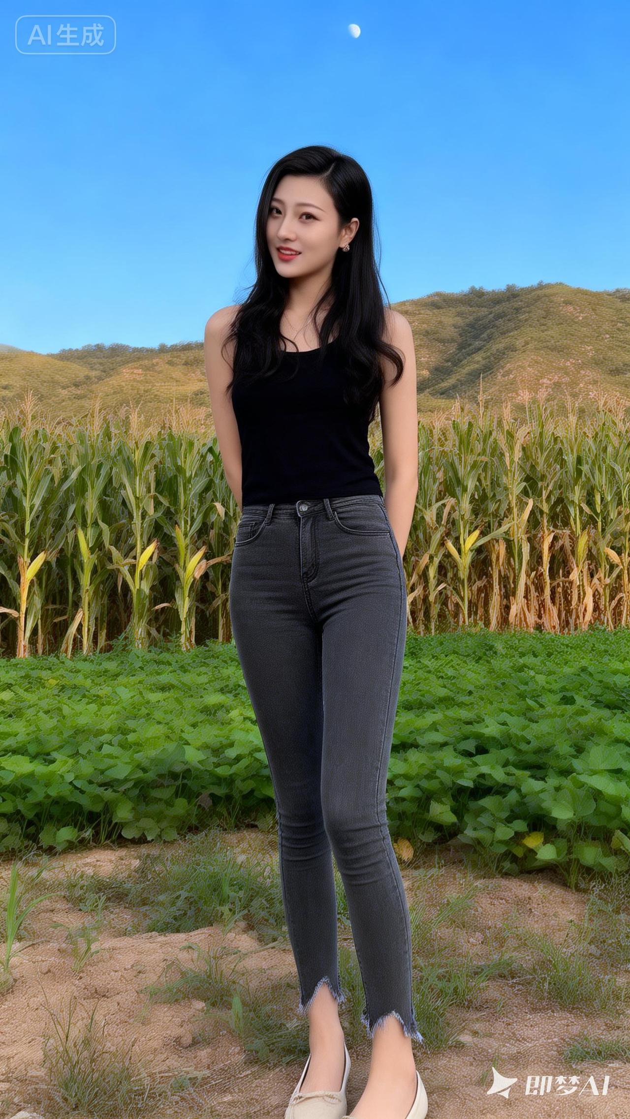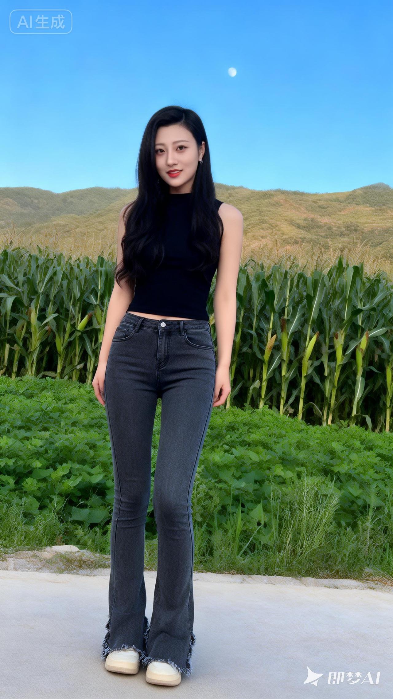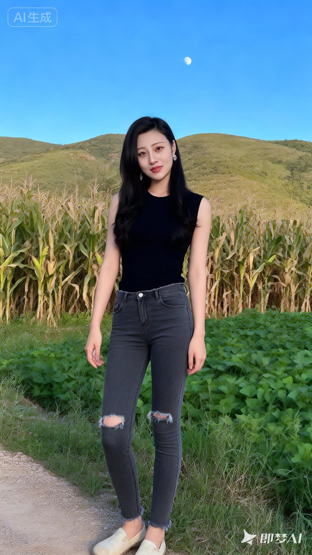 夏日田野风穿搭,黑上衣+破洞牛仔裤,清新自然!🌿👗