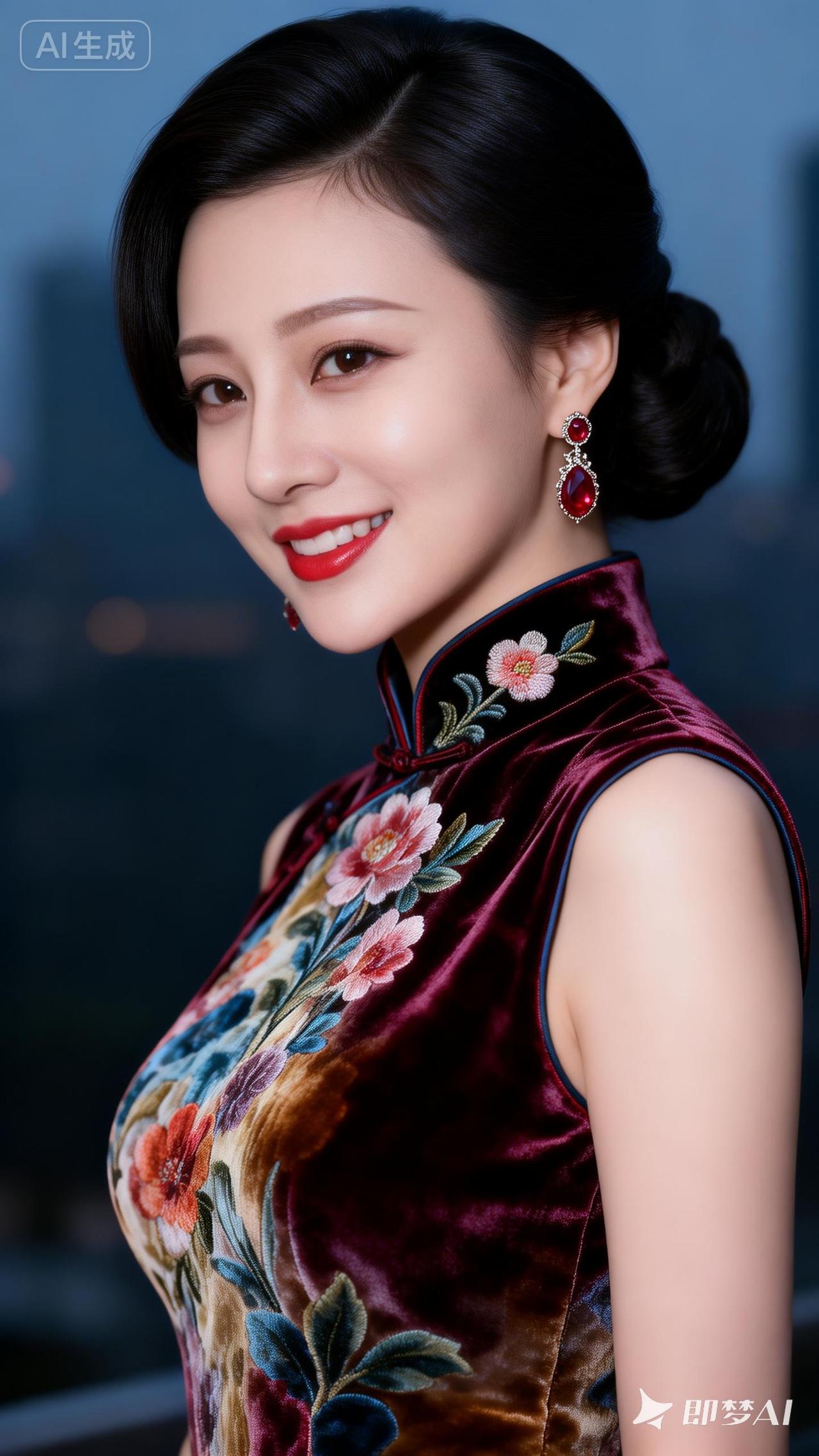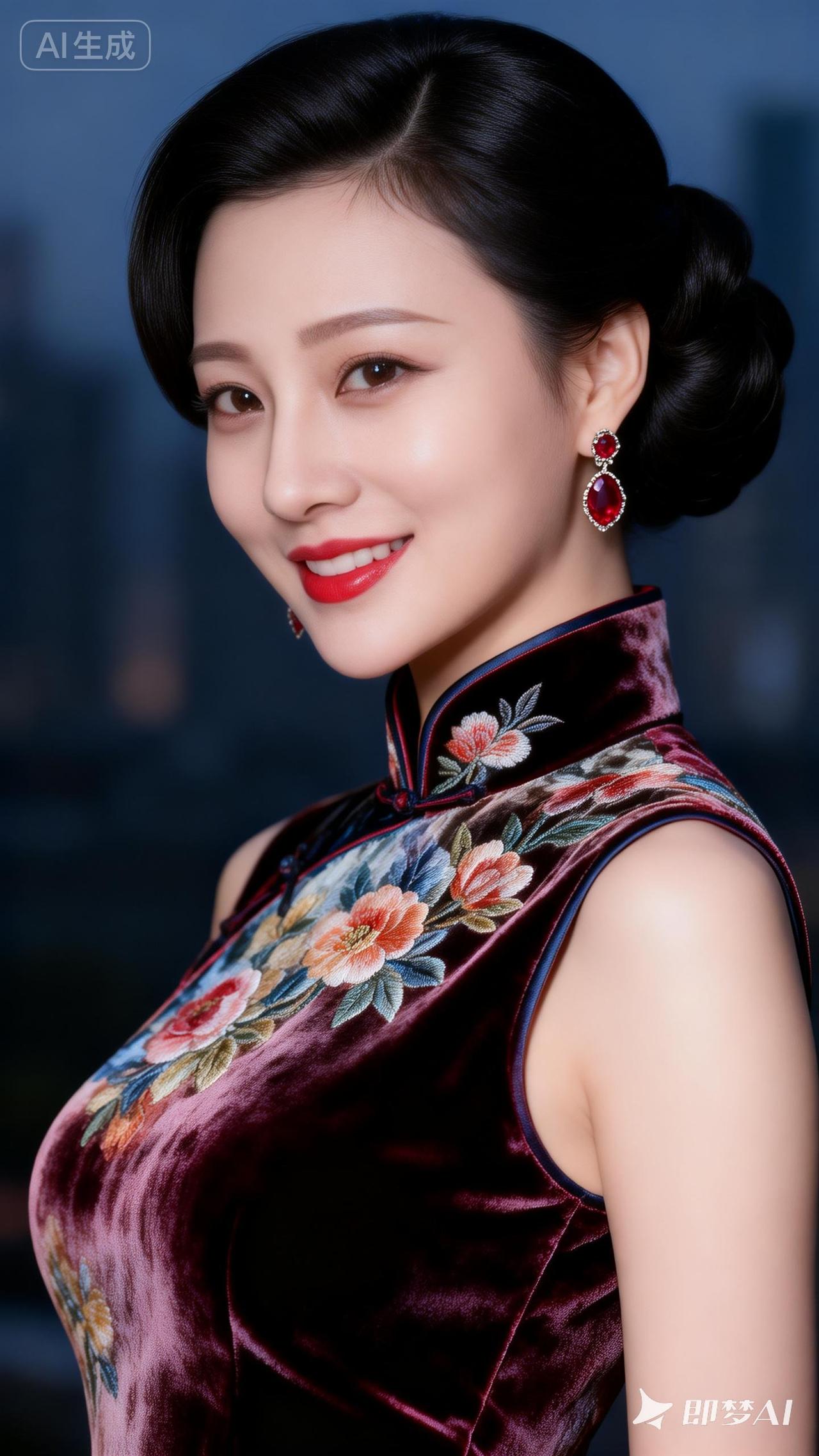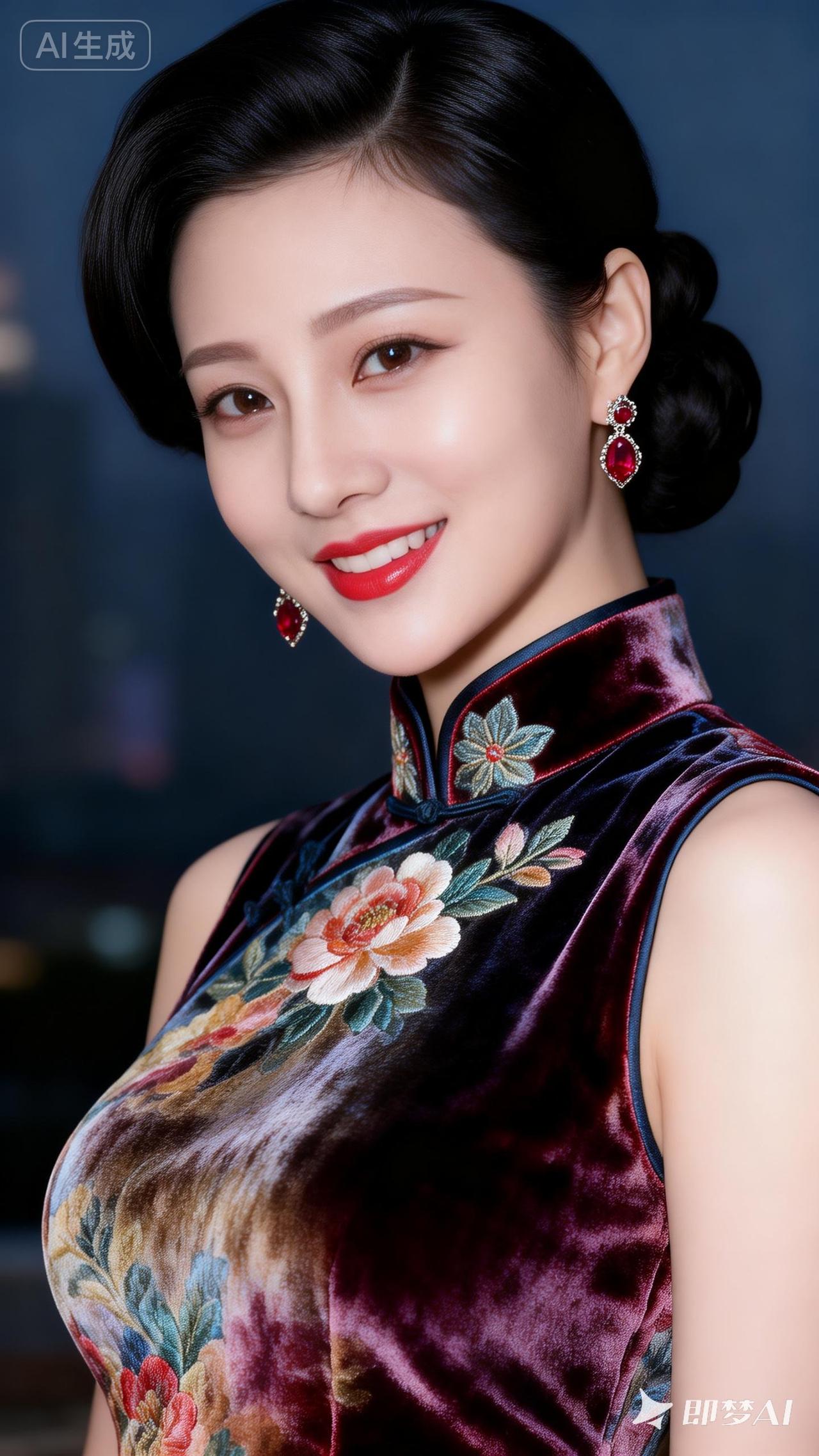 优雅旗袍照,红唇与花色相映成趣,尽显东方韵味!🌸💄