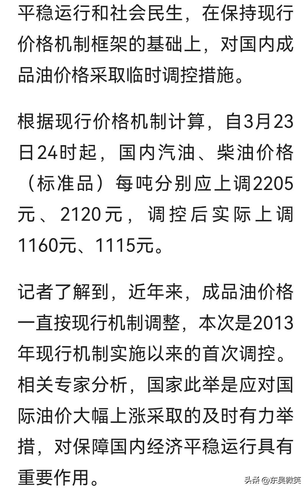 国家出手干预调整油价了 新华社消息,根据现行的价格调整机制,3月23日24时,国内汽柴油将会分别上涨2205元、2120元每吨。 国家发改委为保障经济平稳运行和民生,决定对国内成品油价格采取临时调控,调控后汽油、柴油每吨分别上涨1160元、1115元,折合下来汽油、柴油每升分别上涨0.87元、0.95元左右。