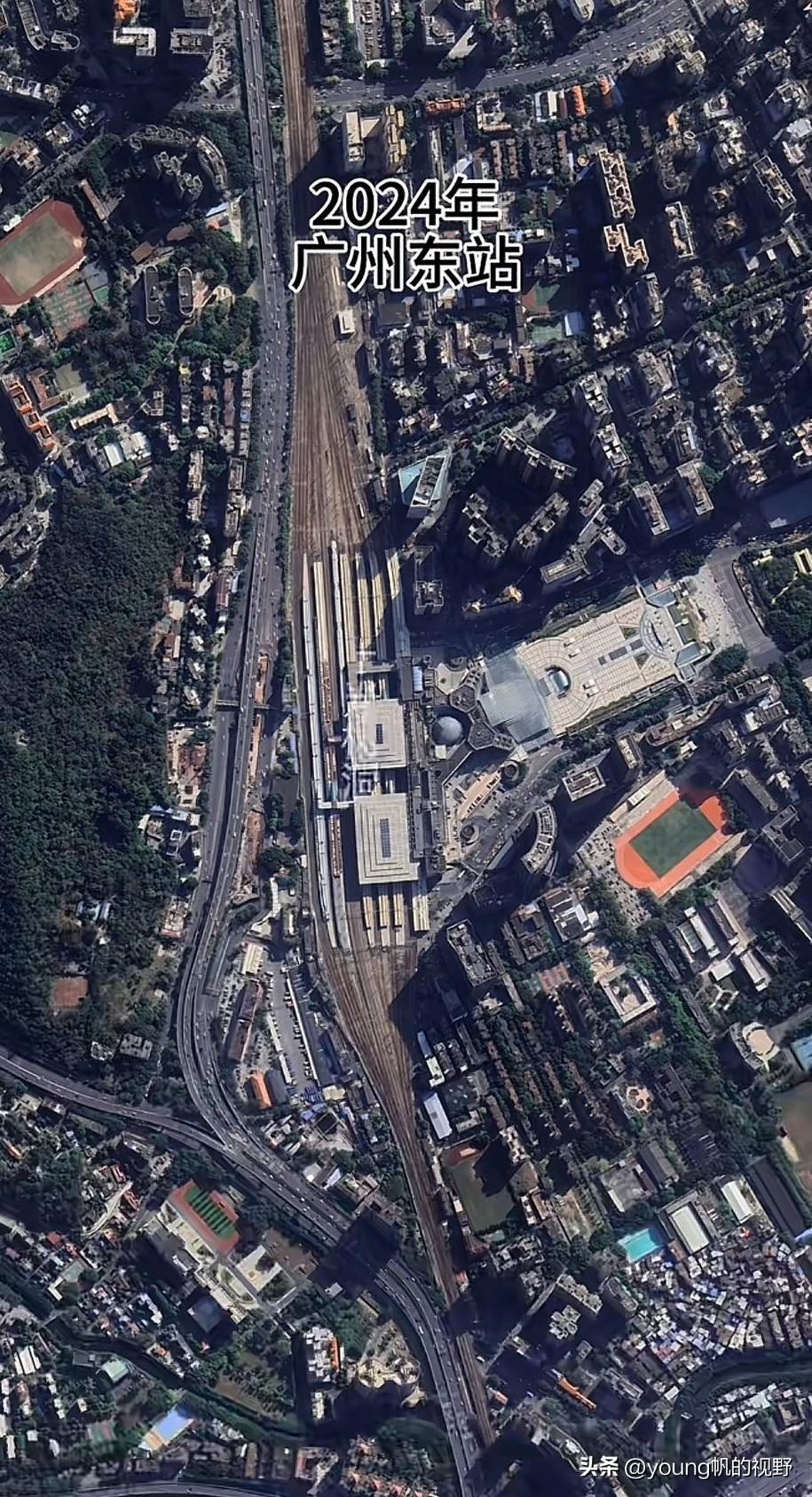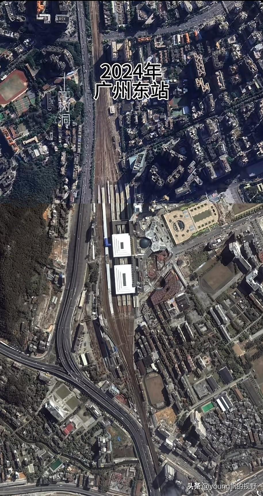 卫星拍摄下的广州火车东站20多年的变迁。从照片内容来看,广州东站主体变化并不大。周边环境中,就属东莞庄和林和东片区发生巨变。作为天河的中心区,当年周围还有一些空地或村庄。如今这些地方都已是高楼遍地,成为广州最繁华的街区之一。