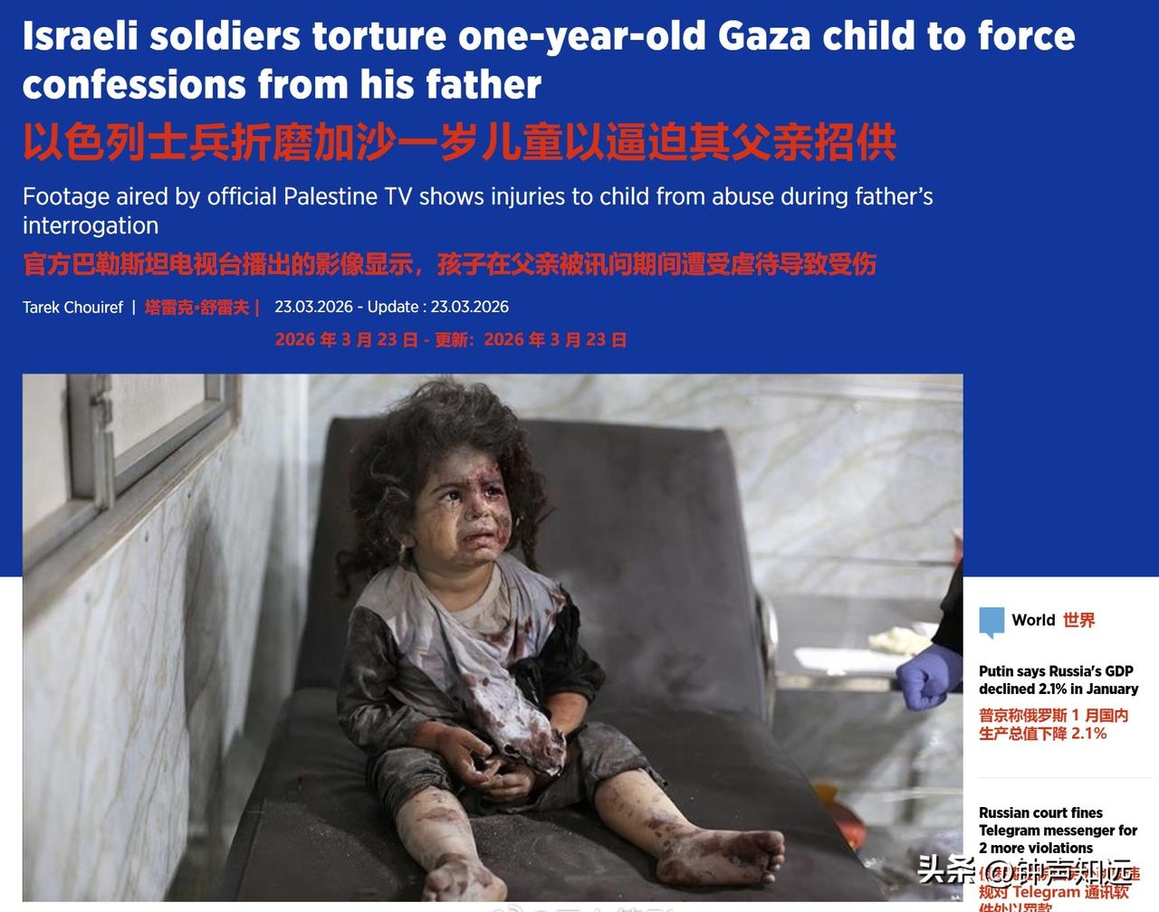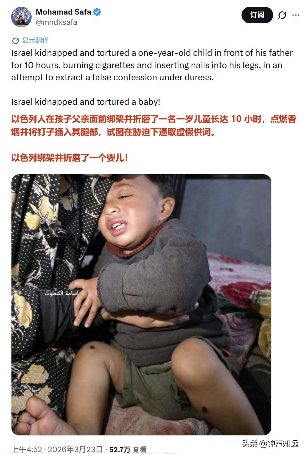 以色列士兵酷刑折磨加沙一岁儿童10小时。 这是2026年3月23日最新曝光的一起发生在加沙的酷刑事件,已被巴勒斯坦电视台、阿纳多卢通讯社等多方报道,并获得医疗报告证实。 事发地点在加沙中部马加齐难民营附近,孩子是仅18个月大的卡里姆,父亲奥萨马带着孩子出门采购物资,在离家不远的地方遭到以色列士兵的枪击胁迫,士兵命令奥萨马把怀中的孩子扔在地上,不准有任何触碰,奥萨马在暴力威慑下只能眼睁睁看着孩子被留在冰冷的泥地上,无奈走向哨卡。 抵达检查站后,奥萨马立刻被士兵控制,不仅被脱光搜身,还被戴上手铐、蒙上双眼,押到一旁接受审讯,而卡里姆也被士兵带到了现场,父子近在咫尺却被禁止接触。以色列士兵当着父亲的面折磨年幼的孩子,以此逼迫奥萨马承认莫须有的“恐怖分子”罪名。 以色列士兵先是把点燃的香烟狠狠按灭在卡里姆的大腿、小腿部位,反复烫烧,年幼的孩子疼得撕心裂肺大哭、拼命挣扎爬动,却被士兵死死按住,任由烟蒂在稚嫩的皮肤上留下碳化的伤口。 随后以色列士兵又用尖针、小刀在孩子的手脚、四肢随意刺扎,留下多处深浅不一的穿刺伤口,面对奥萨马撕心裂肺的哭喊哀求,士兵毫无动容,甚至边笑边继续施暴。 最令人发指的是,士兵拿出粗铁钉,用硬物和枪托直接将钉子砸入卡里姆的小腿,铁钉穿透皮肉,几乎触及腿骨,孩子的哭声渐渐微弱,而一旁的父亲在极致的痛苦和绝望中几近崩溃。 这场折磨持续了近10个小时,卡里姆被以军非法扣留期间,始终承受着身体与精神的双重摧残,直到红十字会介入交涉,孩子才被送回马加齐难民营的家人身边,而父亲奥萨马至今仍被以军非法拘留,下落不明。 经专业医疗检查,卡里姆的身体留下了清晰且触目惊心的伤痕,腿部有多处圆形香烟碳化烫伤,四肢遍布锐器穿刺伤,小腿的铁钉贯穿伤更是造成了骨膜损伤,还存在严重的感染风险,除此之外,孩子因长时间受虐出现了极度惊吓、脱水、营养不良的症状,精神层面也留下了难以磨灭的创伤。 这种虐待不是个别行为,而是以色列对巴勒斯坦人系统性施暴的缩影。联合国最新调查报告指出,自2023年10月以来,以军在加沙逮捕超1.85万名巴勒斯坦人,其中包括1500名儿童,酷刑、强迫失踪、性暴力、饥饿虐待成为常态,斯德泰曼军事拘留中心更是沦为实施暴行的“影子设施”,被拘留者遭电击、放狗撕咬、烟头烫伤成了家常便饭。更令人心寒的是,以色列司法体系还为施暴者提供“保护伞”,此前涉嫌强奸巴勒斯坦囚犯的以军士兵被撤销起诉,这无疑是对暴行的公然纵容,让酷刑成为压迫巴勒斯坦人的“合法手段”。 联合国数据显示,加沙90%的儿童营养不良,数千名孩子被迫截肢,无数孩子在空袭和虐待中失去生命,巴勒斯坦代表在联合国泪洒现场的控诉,喊出的是整个巴勒斯坦民族的绝望:“他们只是孩子啊!” 。而这一切的背后是以色列将酷刑作为集体惩罚手段,甚至涉嫌种族灭绝的冷酷事实,联合国专家明确指出,这些系统性的身心摧残,目的就是制造长期的集体痛苦,动摇巴勒斯坦社群的生存基础。 《日内瓦公约》被肆意践踏,《禁止酷刑公约》成了一纸空文,以色列的暴行早已构成战争罪与反人类罪。国际刑事法院早已对以色列相关高层发出逮捕令,认定其将饥饿作为战争工具、蓄意攻击平民的罪行,国际法院也作出裁决,要求以军立即停止在拉法的军事行动 。但时至今日加沙的惨剧仍在继续,人道援助被封锁,平民仍在遭受无差别攻击,美国等国家的纵容与双标,让国际法的权威被一再挑战,让人类的良知被反复践踏。