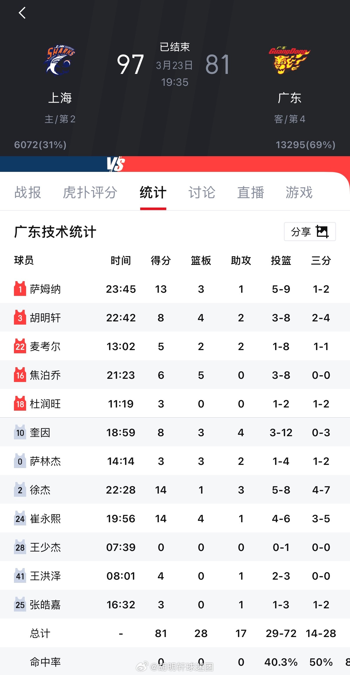 数据方面:🐯胡明轩8分4篮板2助攻1抢断