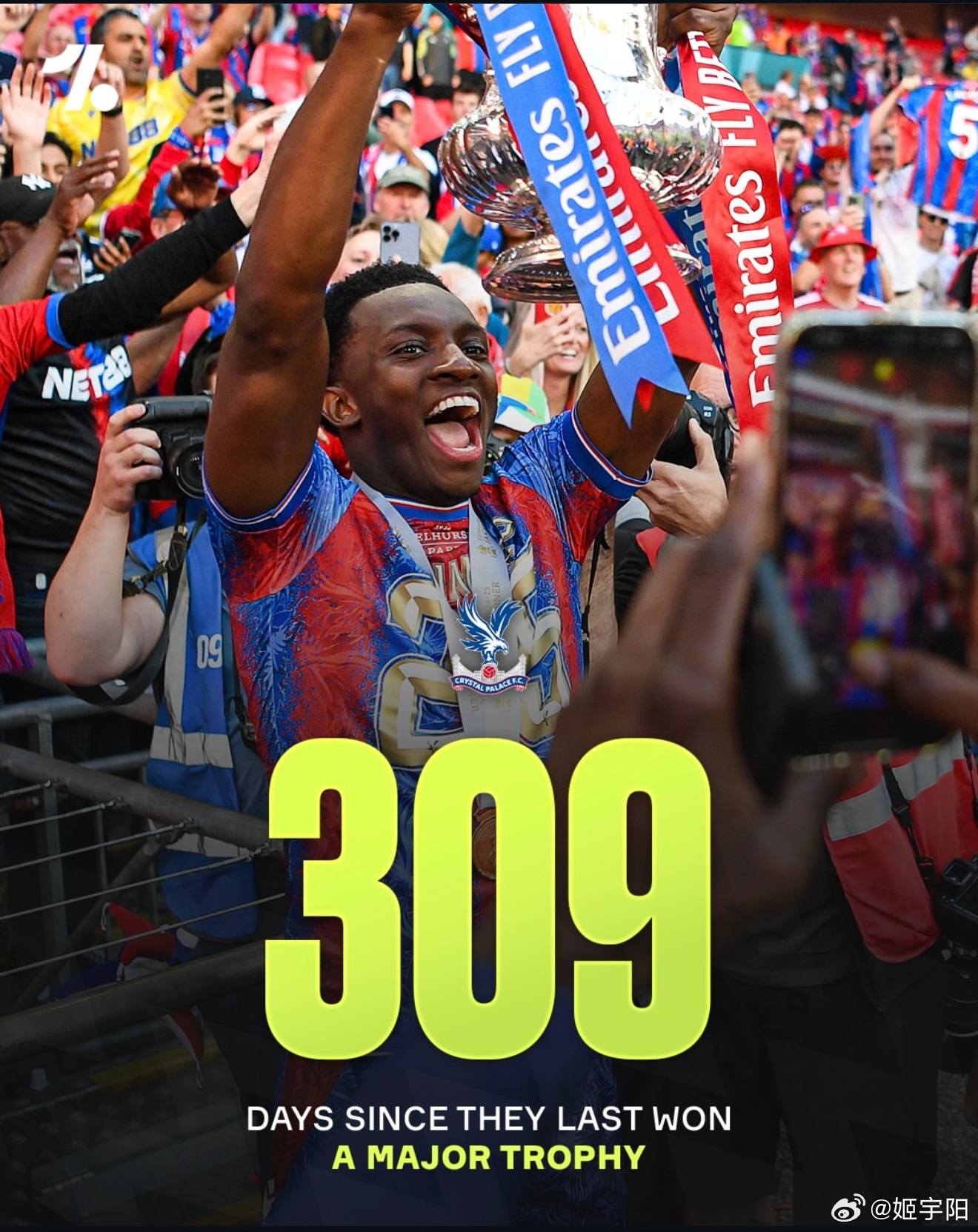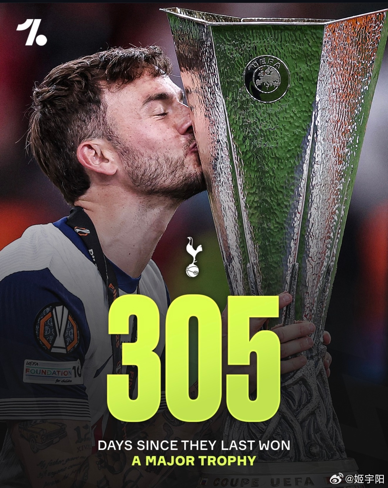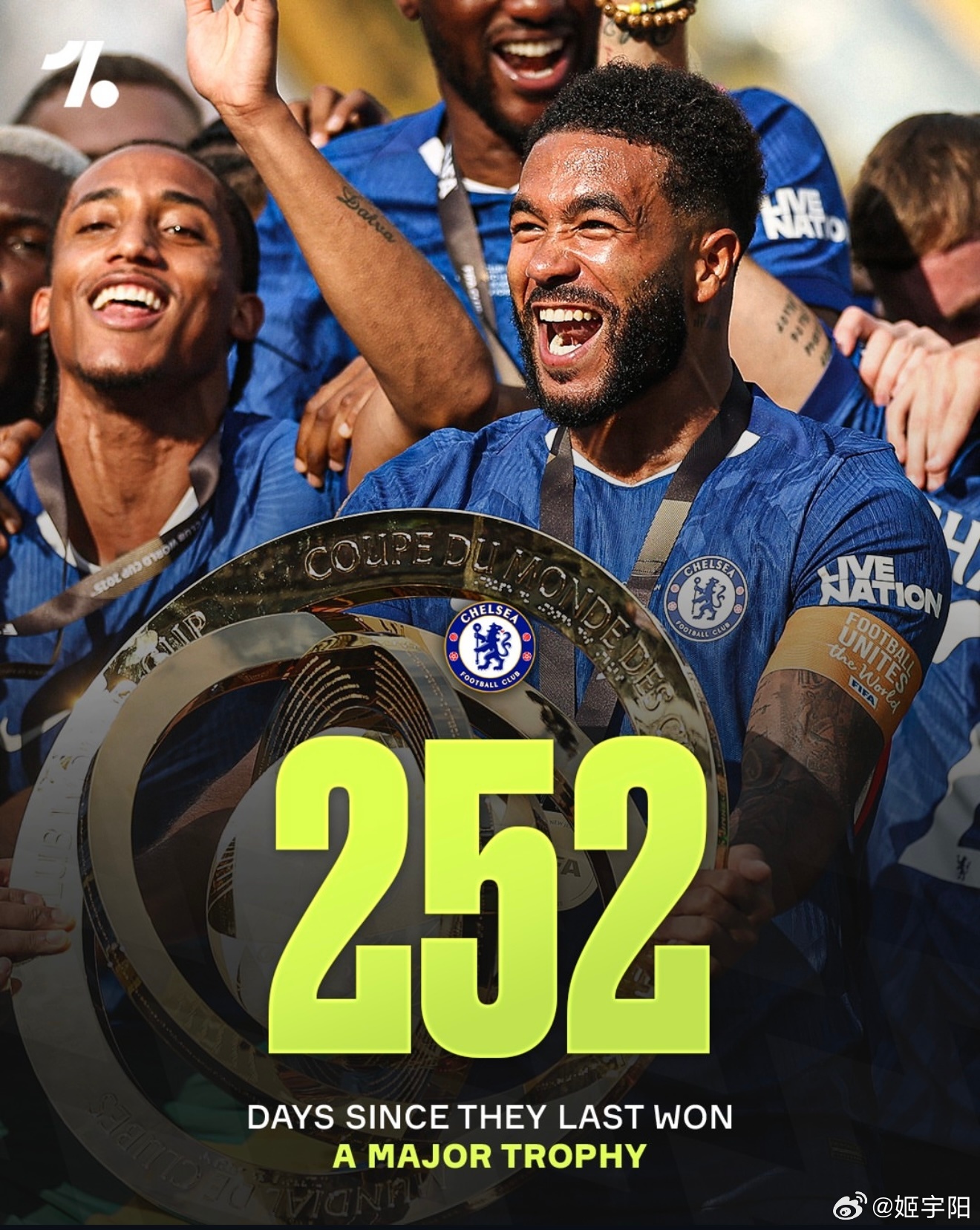图中的数字,分别是他们上一次重要赛事夺冠之后,到现在的总的天数。是按照英国当地时