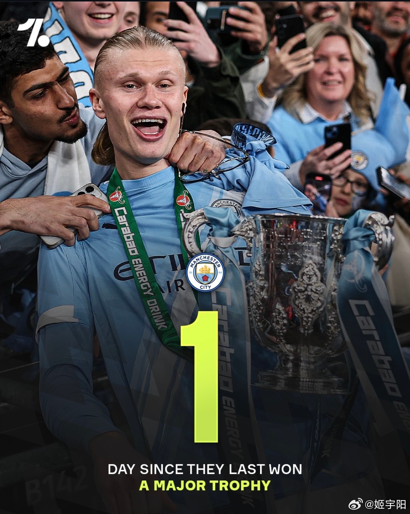 图中的数字,分别是他们上一次重要赛事夺冠之后,到现在的总的天数。是按照英国当地时间,今早一觉醒来计算的。阿森纳是 2060 天。西汉姆是 1020 天。曼联是 667 天。纽卡斯尔是372 天。利物浦是329 天。水晶宫是309 天 。热刺是305 天。切尔西是252 天。曼城是 1 天。