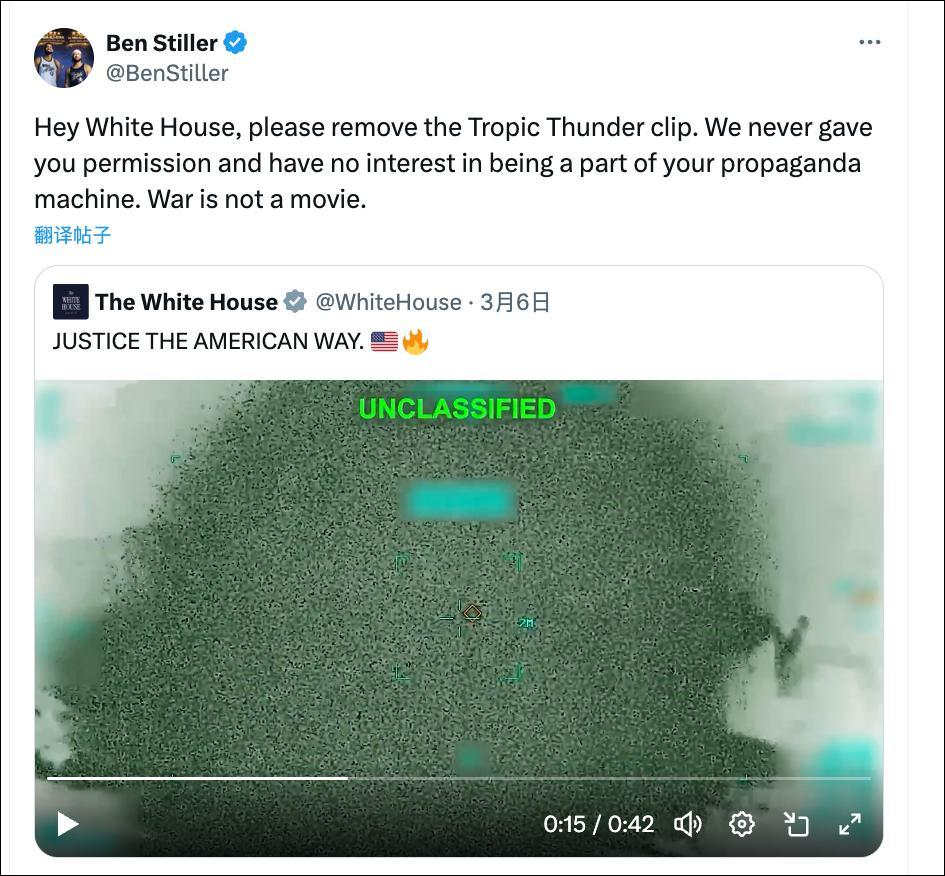 这是好莱坞演员兼导演本·斯蒂勒的社交媒体账号截图。他要求白宫删除取自他电影《热带惊雷》的剪辑片段,并表示“战争不是电影”。