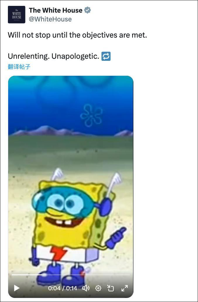 这是美国白宫社交媒体账号截图。该账号发布的这段视频中,海绵宝宝、电子游戏的欢快旋律与空袭伊朗的火光被剪辑在一起,视频配发文字“不达目的不罢休”。